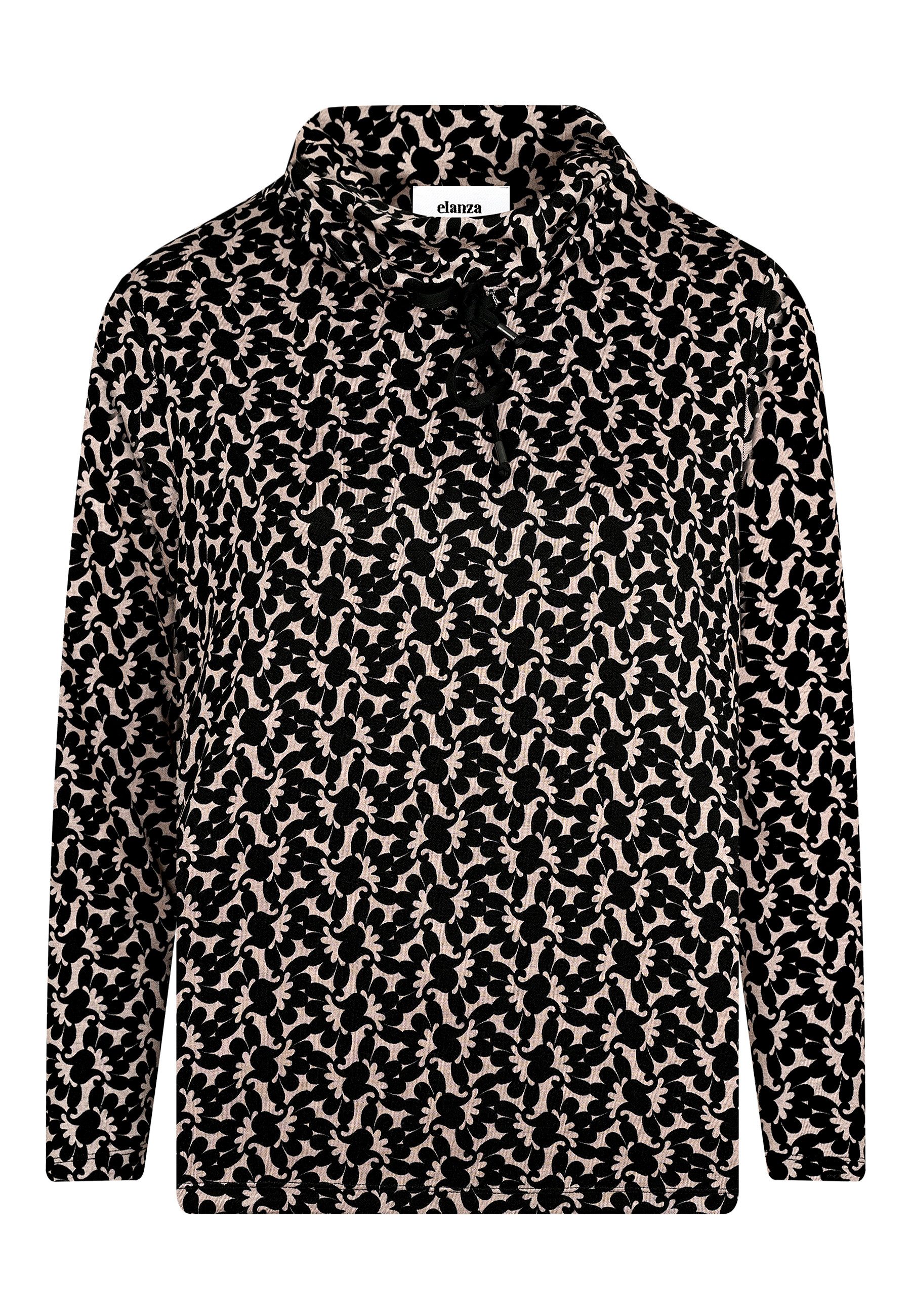 Dieses elanza-Shirt ist ein tolles Basic, das gekonnt einen modischen Ornament-Print mit einem breiten Kragen kombiniert, der sowohl elegant als auch leger wirkt. Dank Tunnelzug mit Bändchen kann der Rollkragen, der angenehm halsfern geschnitten ist, individuell in der Weite eingestellt werden. Die elanza-typische, exklusive Jersey-Qualität ist als hochwertiger Doubleface-Jersey gearbeitet, liegt dank hohem Viskoseanteil super glatt und weich auf der Haut, hat einen eleganten Fall und behält den ganzen Tag seine Form. In Beige und Schwarz gehalten, ist dieses Longsleeve ein perfekter Kombi-Partner für viele Looks: Ob zu den neuen Comfort-Denims in Schwarz oder hellem Sand oder zu klassischen Stoffhosen – ein Shirt, das Ihnen viele Looks schenkt und auch perfekt zum schwarzen Bouclé-Cardigan der elanza-Kollektion passt.