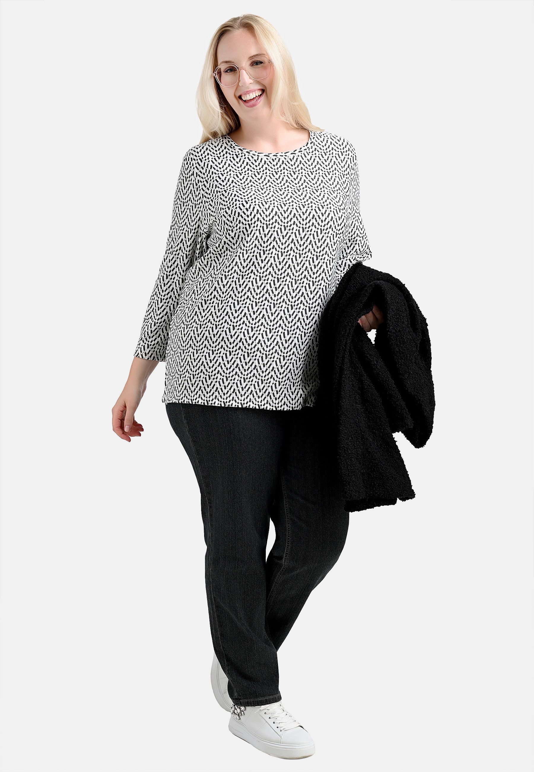 Mit diesem Shirt hat elanza ein ganz besonderes Modell entwickelt, das den klassischen Shirt-Schnitt mit einer außergewöhnlichen Qualität kombiniert. Das feine Jacquard-Muster in Weiß und Anthrazit schafft eine leichte Struktur, die das Shirt dynamisch wirken lässt. Gleichzeitig hat der Jersey eine angenehme Dichte, die einen perfekten Sitz garantiert. Ein breites Bündchen am Halsausschnitt sowie Ärmel in praktischer 3/4-Довжина verleihen dem Modell eine feminine Eleganz, seitliche Bewegungsschlitze unterstützen den lockeren Fall. Ein hochwertiges Shirt, das mit seiner klaren Schnittführung und dezenten Farbgebung sowohl elegant zu Stoffhosen oder schlichten Röcken wie auch leger zu den elanza-Comfort-Jeans und Strickcardigan gestylt werden kann.