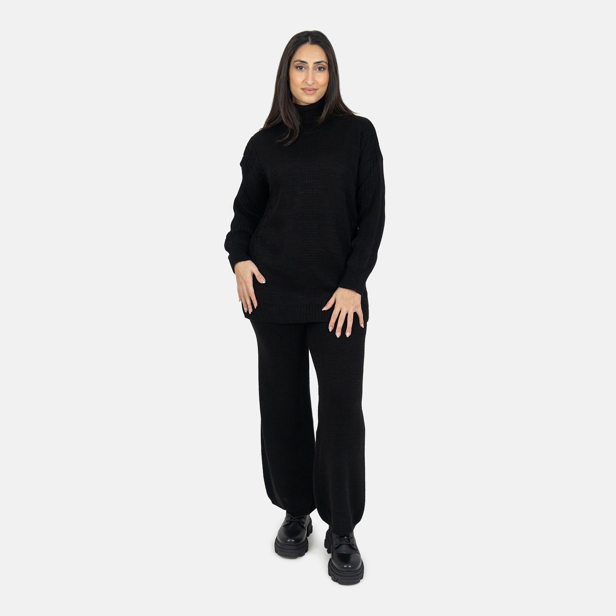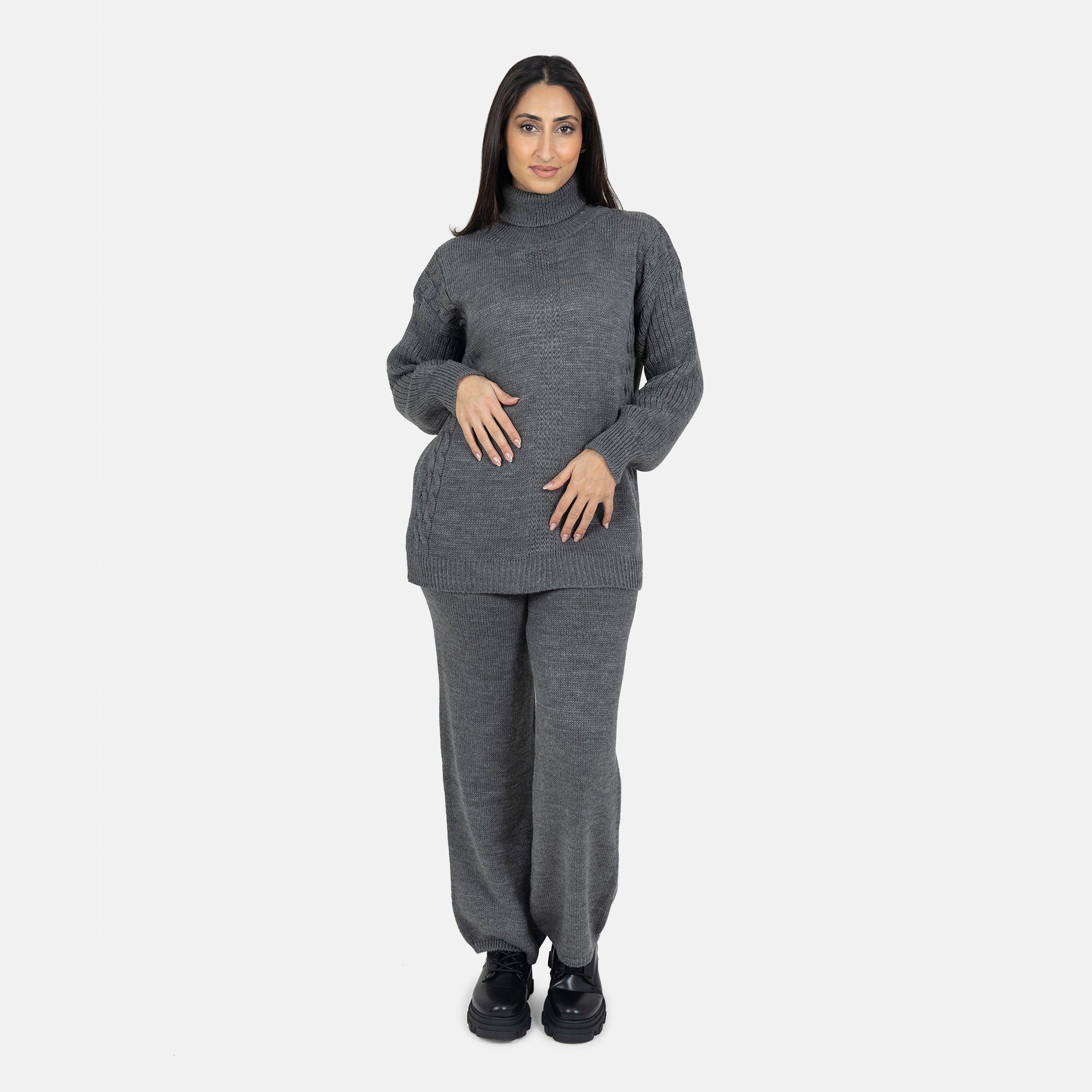 Tauchen Sie ein in eine Welt zeitloser Eleganz und beispielloser Bequemlichkeit mit unserem Damen One Size Strick-Zweiteiler. Dieses Set, bestehend aus einem schicken Pullover und einer passenden Hose, wurde entwickelt, um Frauen aller Größen und Formen zu schmeicheln. Die vielseitige Passform des Strick-Zweiteilers ist ein Meisterstück der Textilkunst. Der geschmeidige Strickstoff schmiegt sich sanft an Ihre Figur an und bietet den ganzen Tag über ein Gefühl der Leichtigkeit und Freiheit. Endlich müssen Sie sich nicht mehr um die perfekte Passform sorgen - unser One Size Konzept passt sich Ihnen an. Der Pullover zeichnet sich durch einen klassischen Rundhalsausschnitt und lange Ärmel aus, die sowohl Wärme als auch Stil bieten. Die passende Hose ist bequem und betont gleichzeitig Ihre Silhouette auf schmeichelhafte Weise. Die harmonische Kombination von Pullover und Hose verleiht Ihnen einen zeitlosen Look, der sowohl für formelle Anlässe als auch für entspannte Tage zu Hause geeignet ist. Wir legen großen Wert auf hochwertige Materialien. Der Strick-Zweiteiler besteht aus einem Stoff von höchster Qualität, der nicht nur angenehm auf der Haut liegt, sondern auch eine außergewöhnliche Strapazierfähigkeit aufweist. Sie werden die Weichheit und Wärme dieses Strickstoffs schätzen, der perfekt für die kühleren Jahreszeiten geeignet ist. Dieser Zweiteiler bietet endlose Kombinationsmöglichkeiten. Tragen Sie ihn mit Ihren Lieblingssneakers für einen legeren Look oder werten Sie ihn mit eleganten Stiefeln und schmuckvollen Accessoires für besondere Anlässe auf. Dieses Set dient als Leinwand für Ihre Kreativität und ermöglicht es Ihnen, Ihren persönlichen Stil auszuleben.
