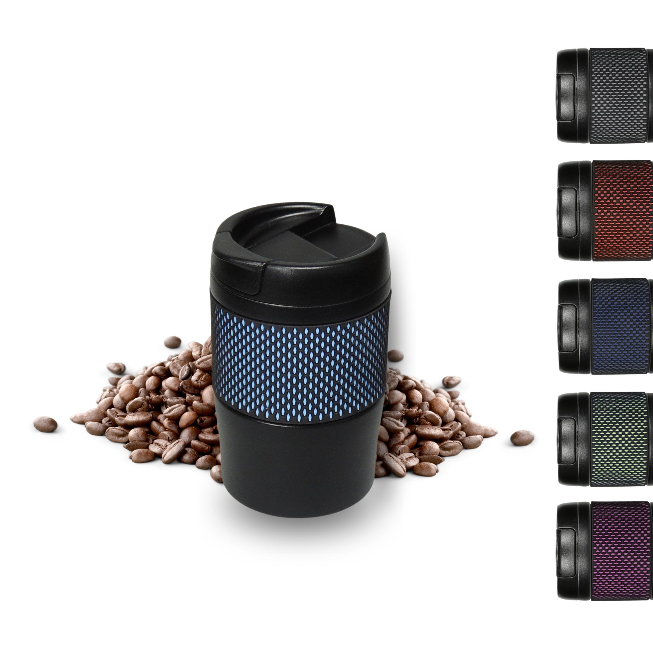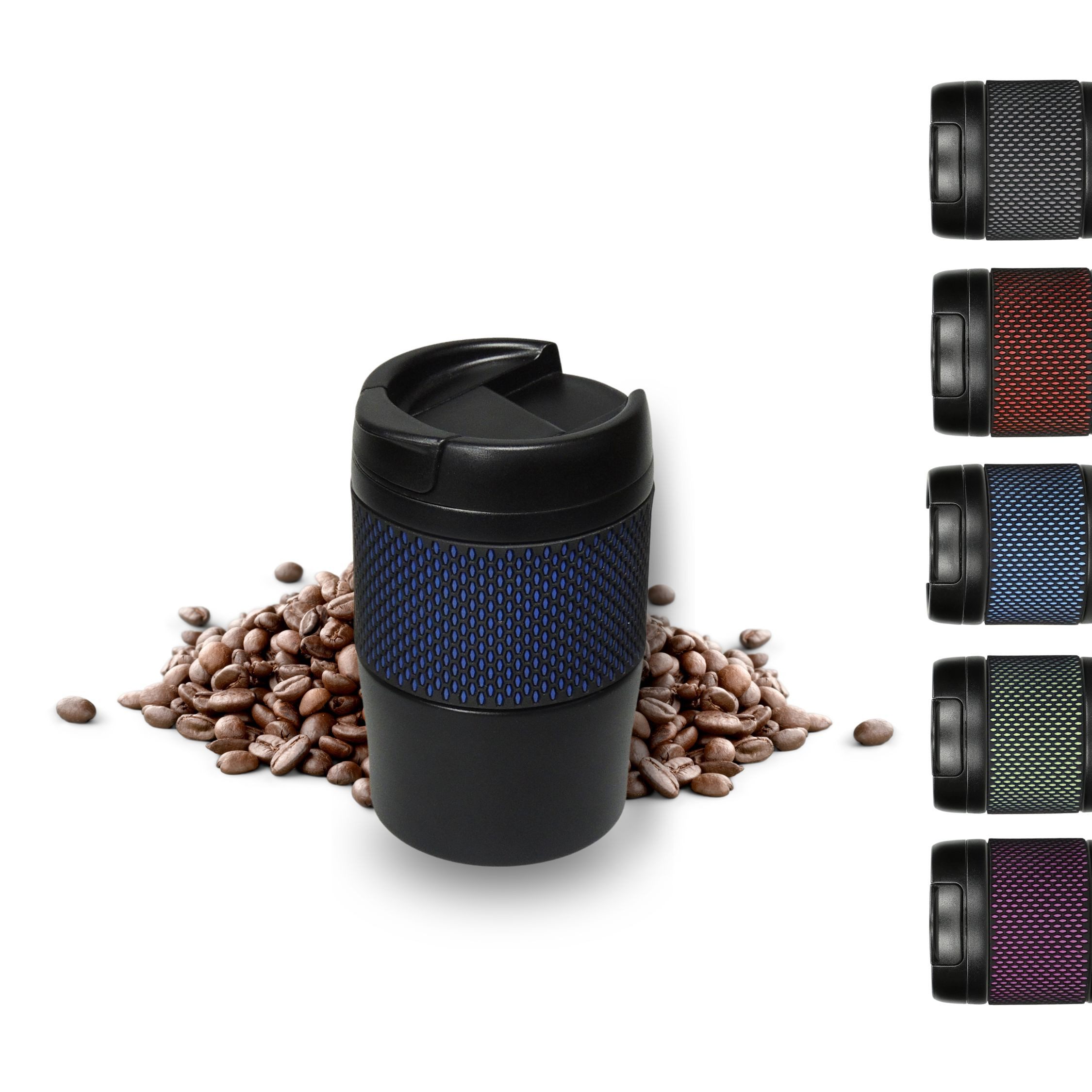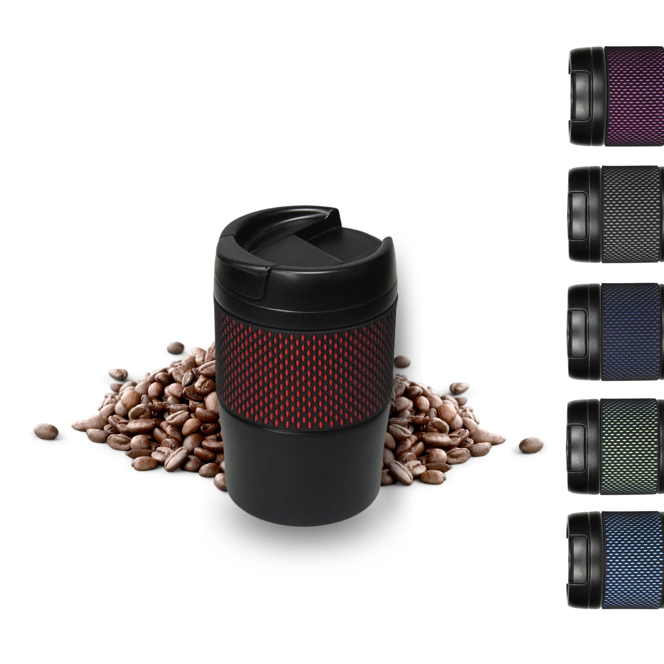 Die graue Silikonmanschette bietet nicht nur einen sicheren Griff, sondern verleiht dem Becher auch ein modernes Erscheinungsbild. Mit einer Füllmenge von ca. 0,3 Litern ist dieser Becher perfekt für unterwegs oder den täglichen Gebrauch zu Hause oder im Büro.