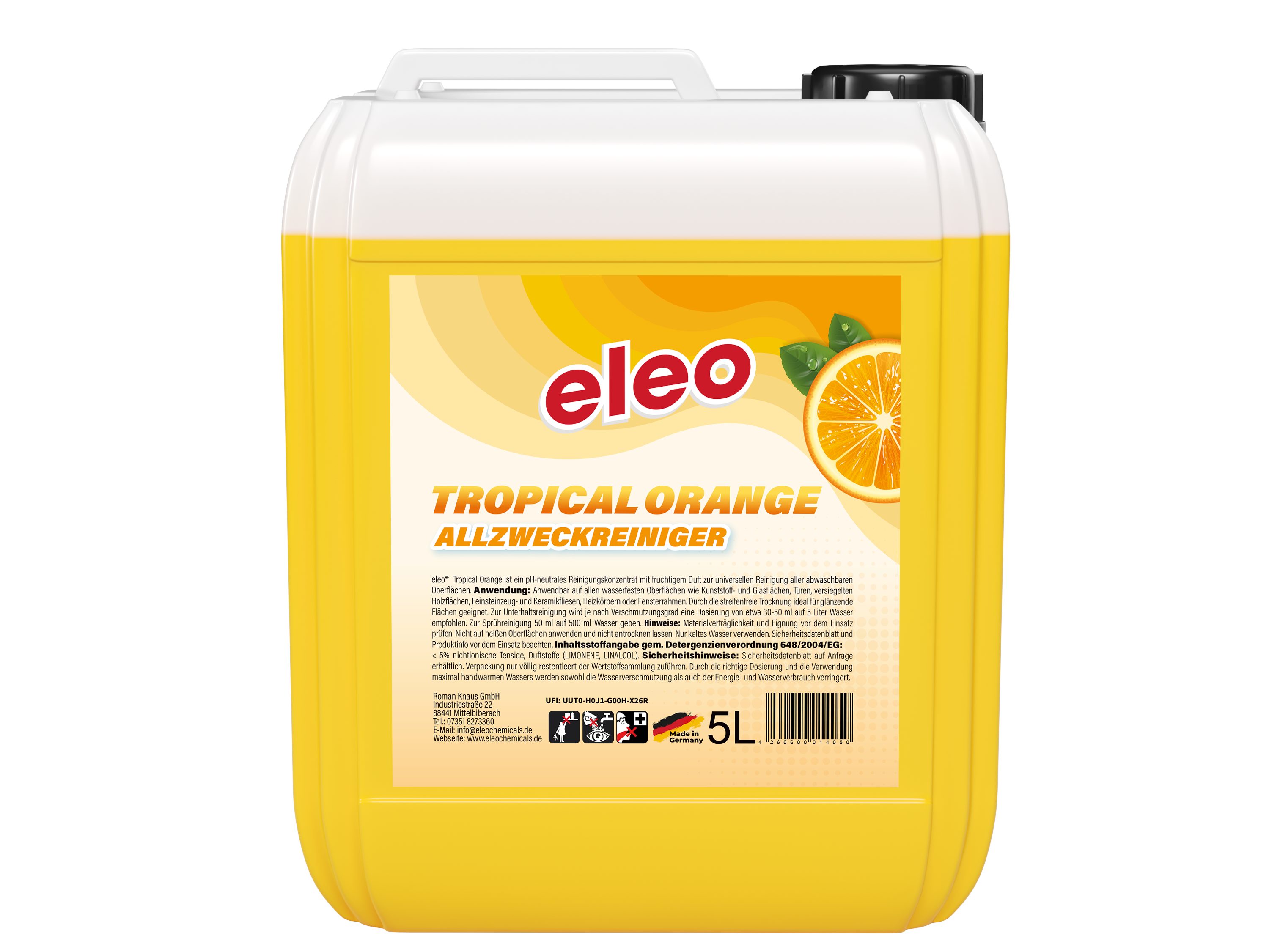 eleo® Allzweckreiniger ist ein pH-neutraler Allzweckreiniger mit einem angenehm fruchtigen Duft nach tropischen Orangen oder maritinem Frischeduft. Das hochergiebige Reinigungskonzentrat eignet sich ideal für die tägliche Unterhaltsreinigung und entfernt zuverlässig Schmutz, Fett und andere Rückstände von sämtlichen abwaschbaren, wasserfesten Oberflächen – streifenfrei und ohne Nachpolieren. Ob Kunststoff, Glas, Türen, versiegeltes Holz, Fliesen oder Heizkörper – eleo Tropical Orange sorgt für Sauberkeit und einen frischen Duft in Haushalt, Büro oder gewerblichen Bereichen. Dank seiner streifenfreien Trocknung ist der Reiniger auch optimal für glänzende Oberflächen wie Edelstahl oder Glas geeignet. Zur Anwendung genügt bereits eine geringe Menge: Für die Unterhaltsreinigung empfehlen wir 30–50 ml auf 5 Liter Wasser. Für die Sprühreinigung werden etwa 50 ml mit 500 ml Wasser gemischt – für ein kraftvolles, aber materialschonendes Ergebnis. eleo Tropical Orange ist pH-neutral, hautfreundlich und hinterlässt einen angenehm frischen Duft nach tropischen Orangen. So vereint der Reiniger leistungsstarke Wirkung mit angenehmer Anwendung – ideal für den täglichen Einsatz. Hinweis: Vor der Anwendung die Materialverträglichkeit an unauffälliger Stelle prüfen. Nicht auf heißen Oberflächen anwenden oder antrocknen lassen. Nur mit kaltem Wasser verwenden. Bitte Sicherheitsdatenblatt und Produktinformation beachten.