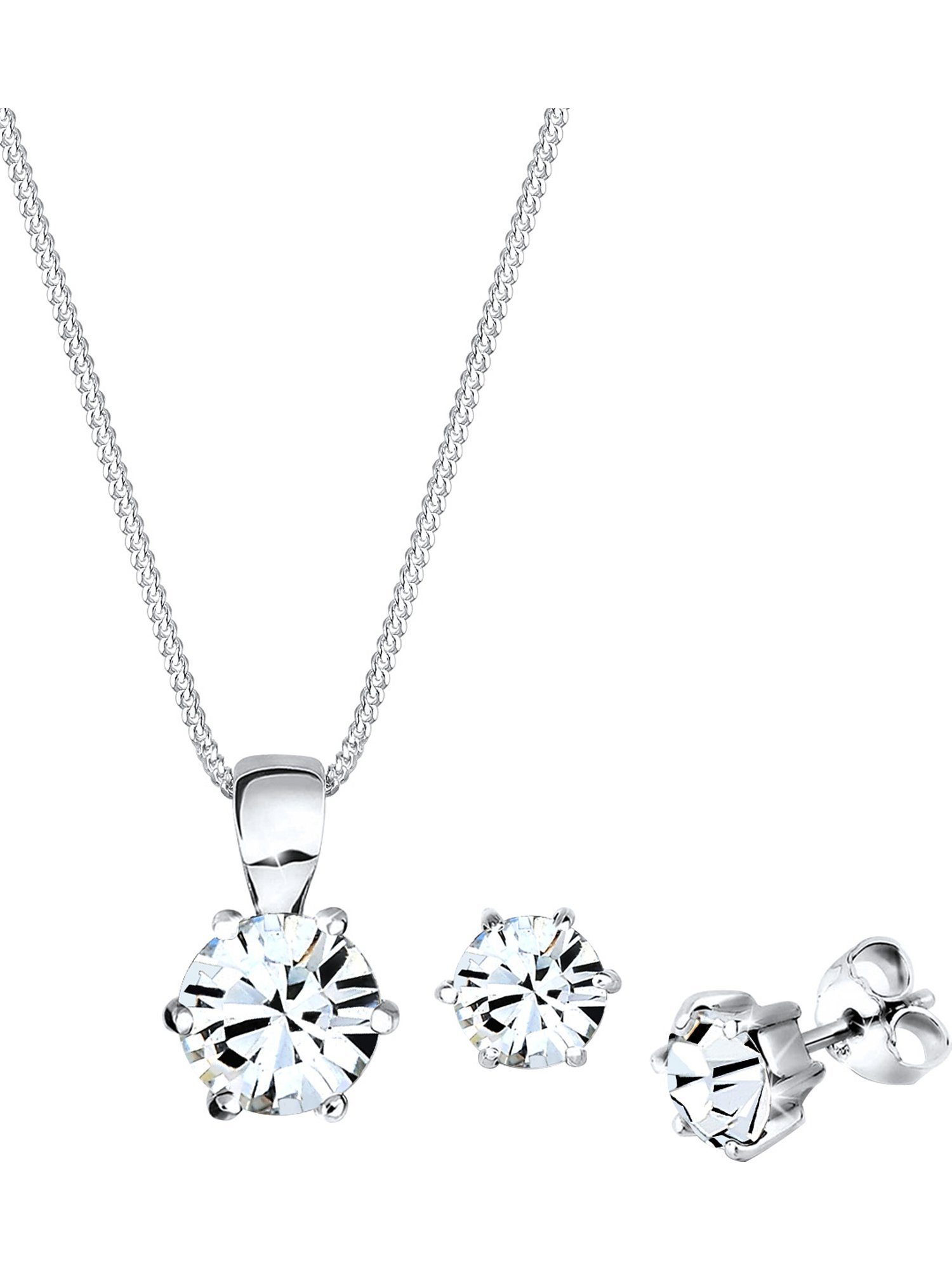 Zu dem Schmuck-Set von Elli aus 925er Silber gehört eine Halskette mit passenden Ohrsteckern. An der mittellangen Kette feiert ein runder, funkelnder Kristall seinen großen Auftritt. Auch die Ohrstecker sind im Solitaire-Stil gehalten und setzen je einen strahlenden Stein in den Fokus. Die schlichten, aber dennoch aufregenden Schmuckstücke werten im Handumdrehen jedes Outfit auf.
