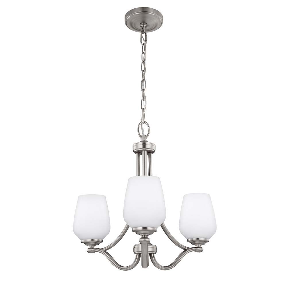 Weinglasförmige, opal geätzte Glasschirme inspirierten den Namen der Übergangskollektion Vintner von Feiss. Das geschwungene Design verwendet oben kleinere und unten etwas größere Arme. Ein dekoratives Kugeldetail fungiert als Sitzstange für jeden Glasschirm für eine elegant schlichte Silhouette in einem Satin-Nickel-Finish.