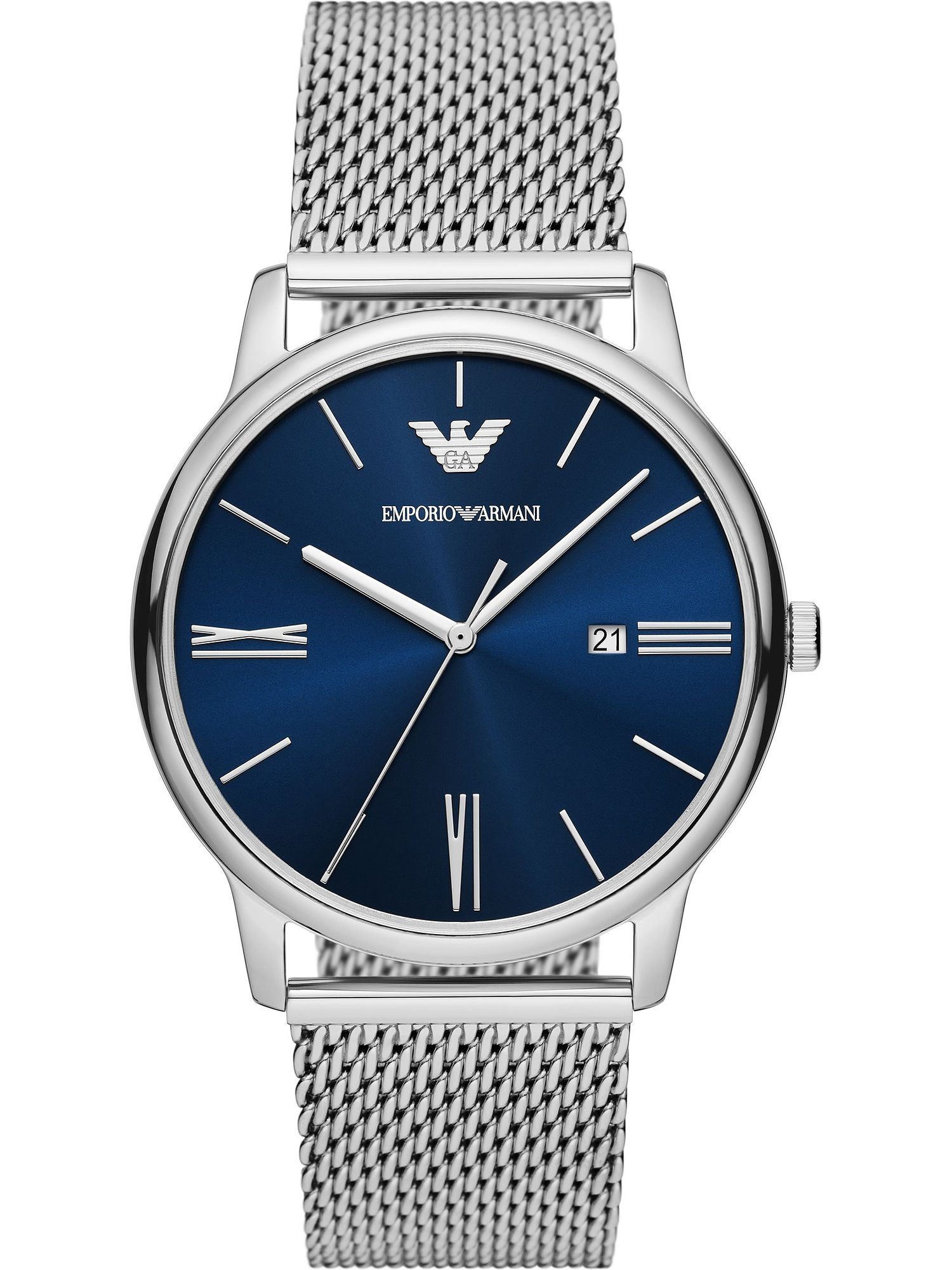 Armani Uhren stehen für puren Luxus und zeitlose Eleganz. Sie verbinden minimalistische Ästhetik mit einem Hauch von Glamour und sind perfekt für alle Menschen, die Wert auf Stil legen. Mit einer Armani Uhr trägst du immer ein Stück italienischer Klasse am Handgelenk. Diese sportlich-elegante Uhr am gleichermaßen schicken wie robusten Edelstahl-Band ist die perfekte Wahl für jeden Mann, der auf der Suche nach einem zeitlosen Klassiker ist. Gehäuse und Armband der Emporio Armani AR11571 sind in Silber gehalten. Das blaue Ziffernblatt ist eine harmonische Ergänzung. Ein echter Allrounder ist das runde Gehäuse mit 42 Millimetern Durchmesser: Es sieht einfach an jedem Handgelenk gut aus. Das integrierte Quarzwerk garantiert zuverlässige Präzision. Schön und praktisch: Die AR11571 zeigt neben der Uhrzeit auch das Datum an. Das verwendete Mineralglas bietet eine gute Sicht und ist widerstandsfähig gegen alle Einflüsse, die bei normalem Gebrauch entstehen. Dieser Zeitmesser ist wasserdicht bis zu 50 Meter (5 Bar) und hält so auch Regen, Spritzwasser oder einem wohltuenden Bad problemlos stand. Mit der Faltschließe lässt sich das Armband leicht anlegen und sicher verschließen. Kurz gesagt: Die Emporio Armani AR11571 Herrenuhr ist ein Statement für guten Geschmack - und ein zuverlässiger Begleiter im Alltag.