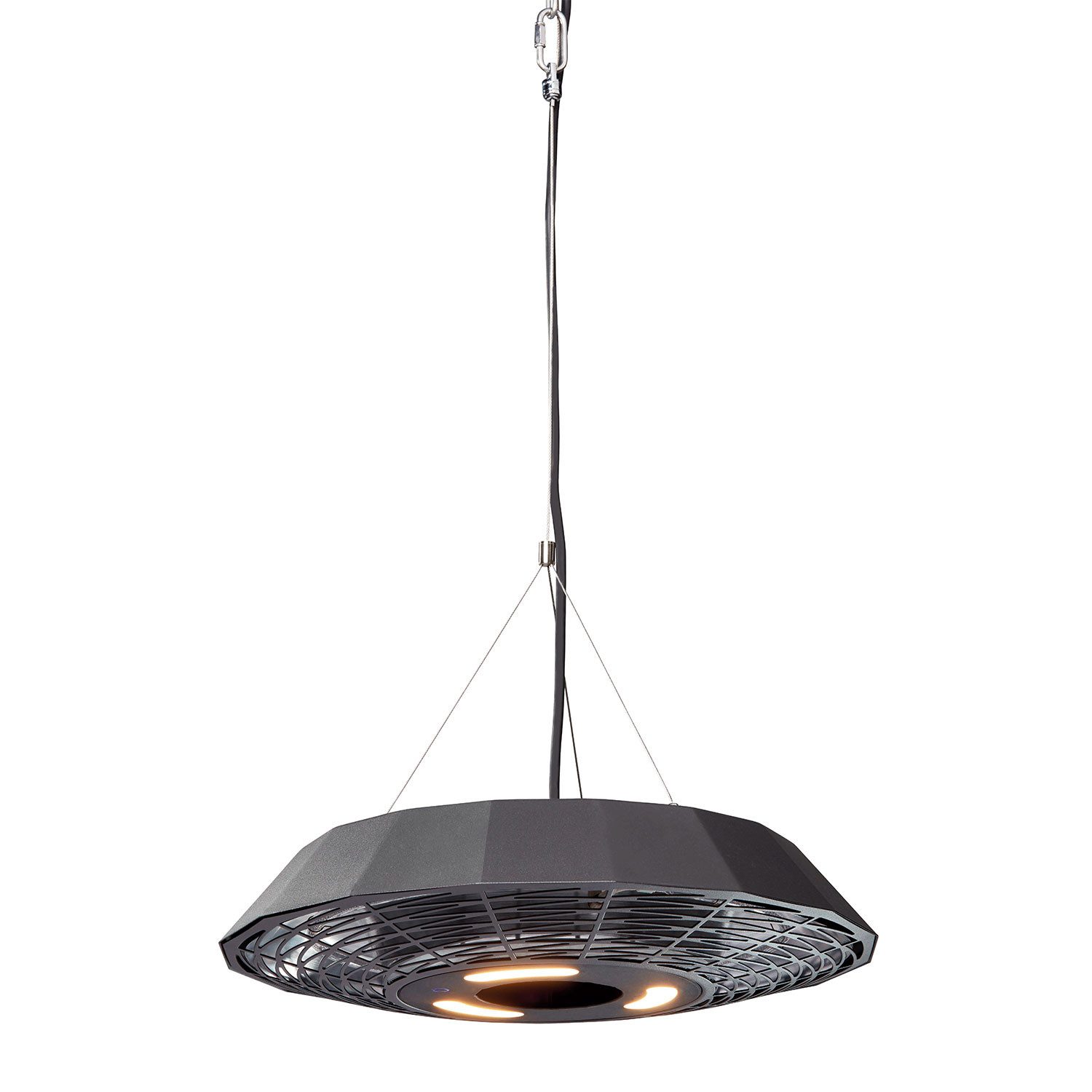Ausstattung Heizlüfter | Höhenverstellbare Aufhängevorrichtung aus Draht mit Schraubkarabiner; Fernbedienung |