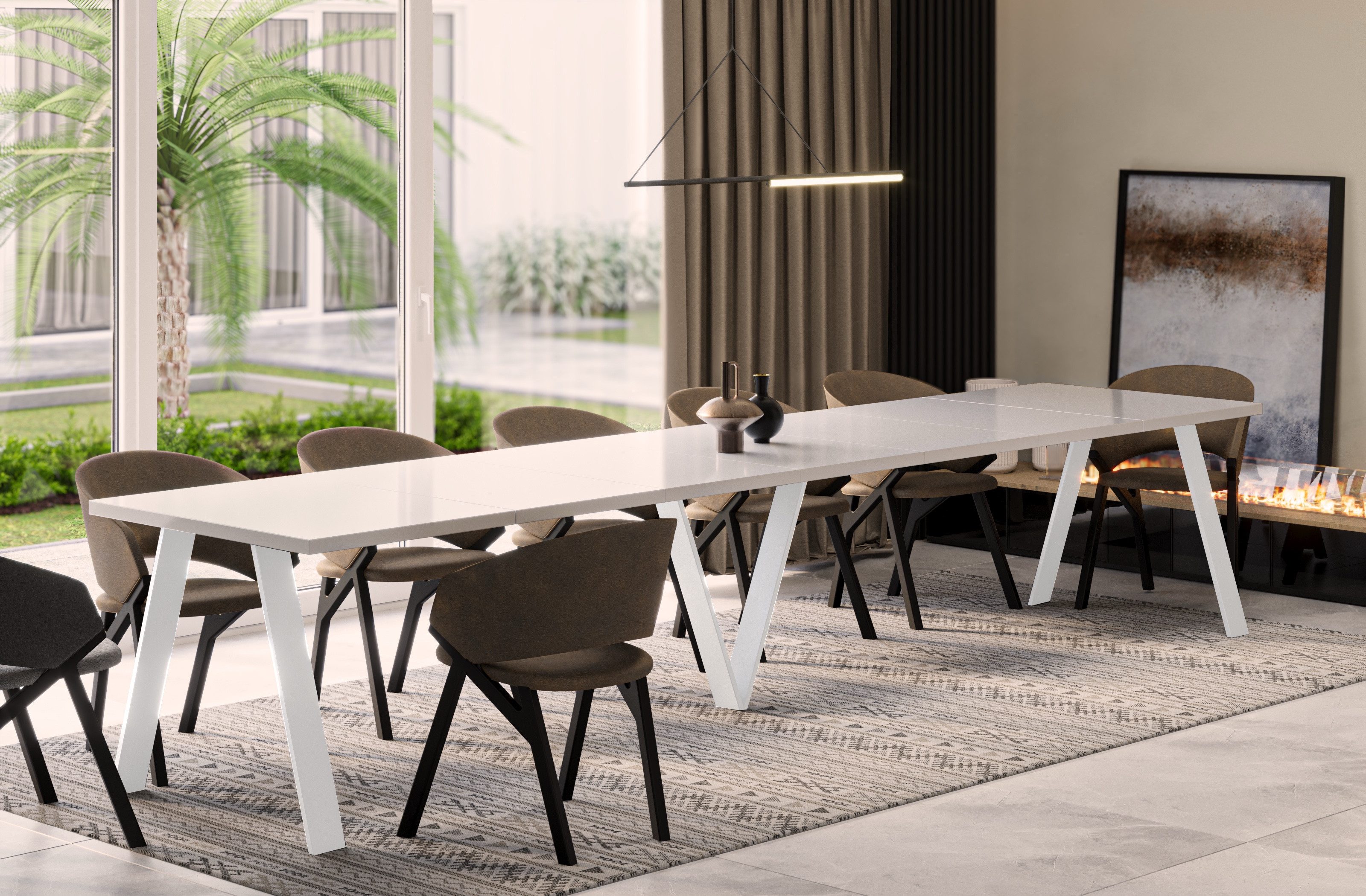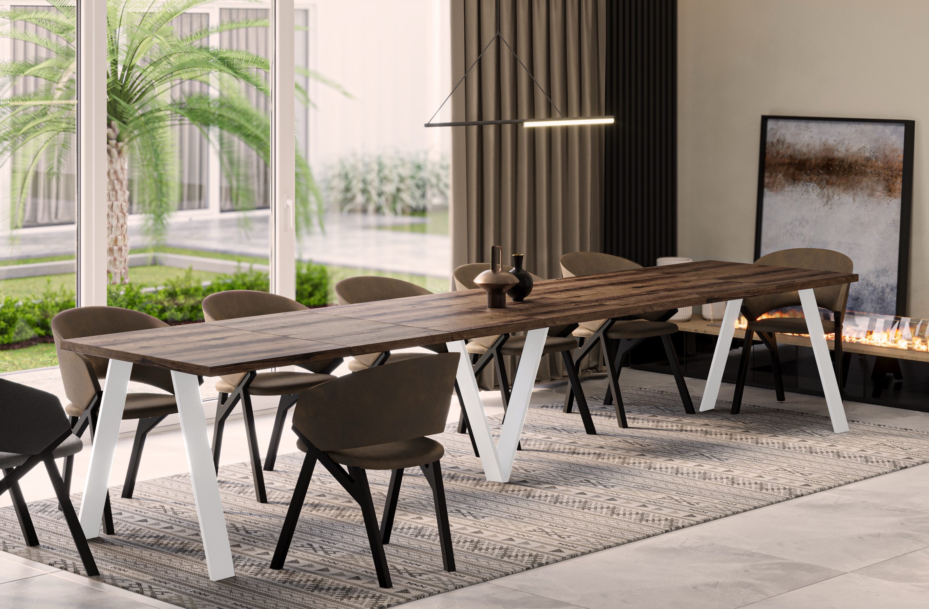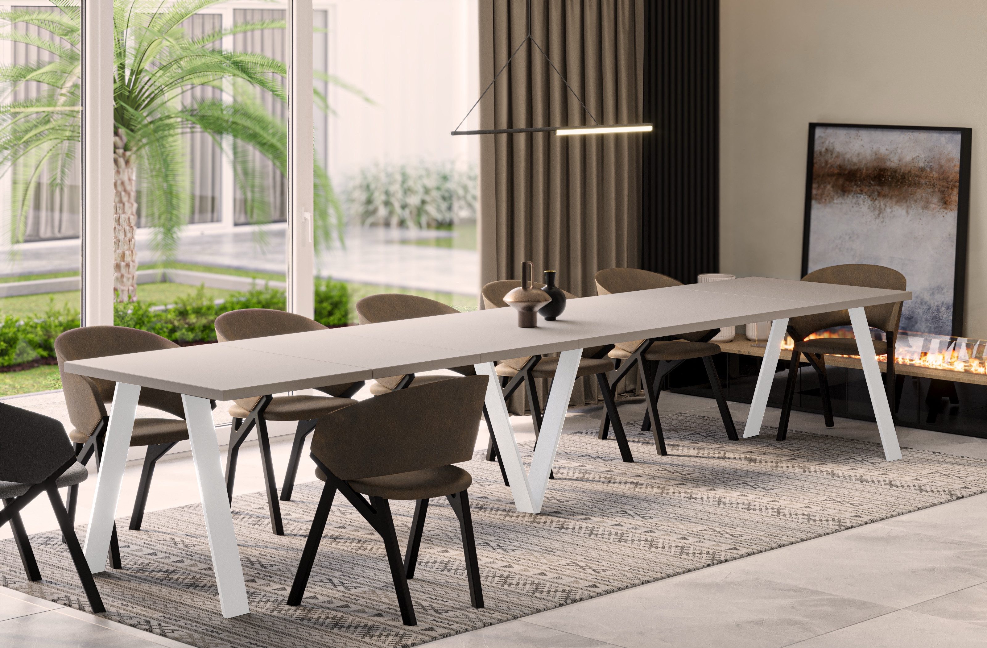 Der ausziehbare Esstisch bietet mit einer maximalen Довжина von 405 cm Platz für bis zu 12 Personen. Dank der Erweiterungsplatten kann die Tischgröße individuell angepasst werden – ideal für Familienessen oder gesellige Abende.