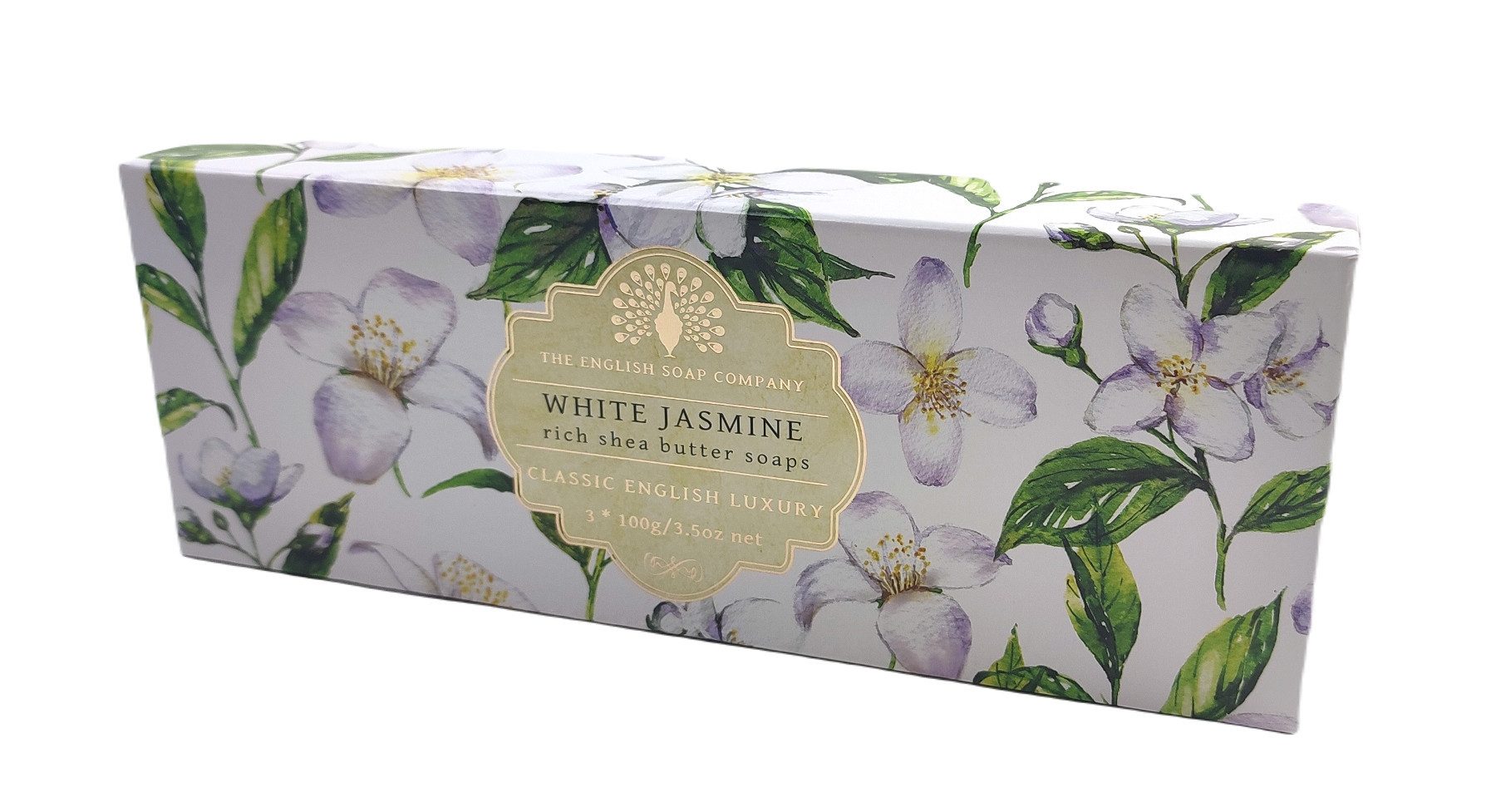 Begib dich auf eine duftende Reise mit der White Jasmine Triple Soap Gift Box! Dieses exklusive Geschenkset enthält drei individuell verpackte 100-g-Seifenstücke, präsentiert in einer zauberhaften Geschenkbox mit bezaubernden englischen Gartenillustrationen.