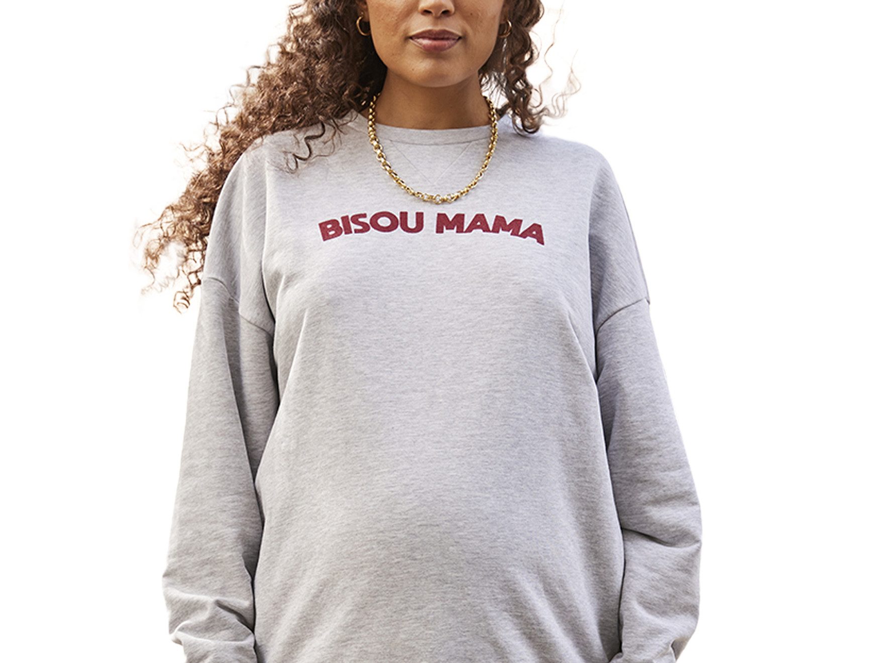 Sweatshirt: Lange Oversized-Passform. Runder Ausschnitt mit Ziernaht. Lange Ärmel. Flockprint-Schriftzug „bisou mama“ („Küsschen, Mama“) vorn. Gerippte Abschlüsse.