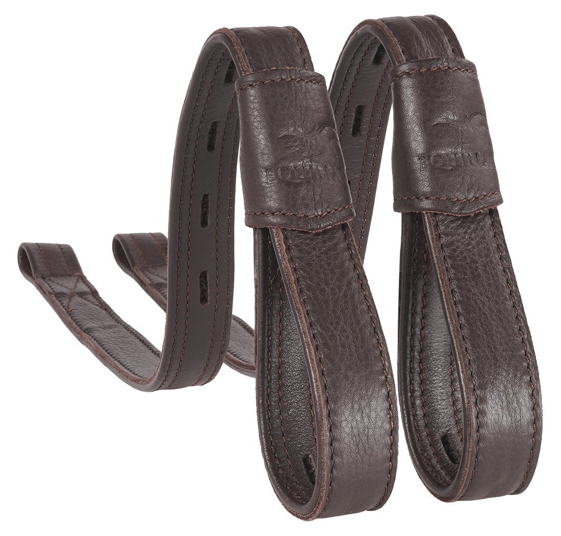 Formstabile Mono-Steigbügelriemen aus Glattleder mit verdeckter T-Schnalle und Nylonkern. Sie werden einfach in die Steigbügelriemenaufhängung am Sattel eingehangen und verlaufen in der Довжина auf nur einen Riemen reduziert, dies spart Gewicht und erhöht den Reitkomfort, da sie weniger auftragen und nicht zum Zwicken neigen. Die besonders flachen Schlaufen können auch durch schmale Steigbügelöffnungen geführt werden.