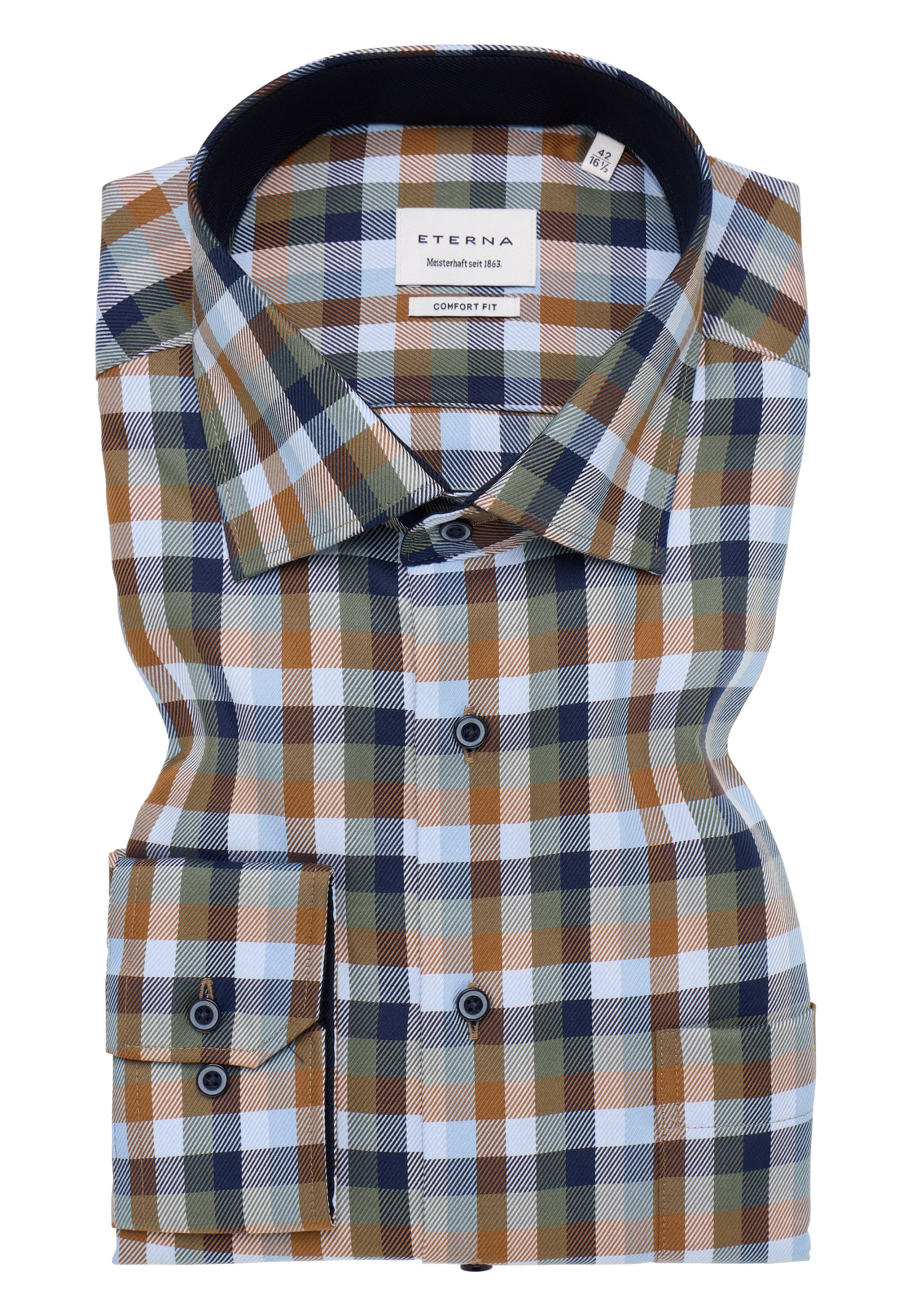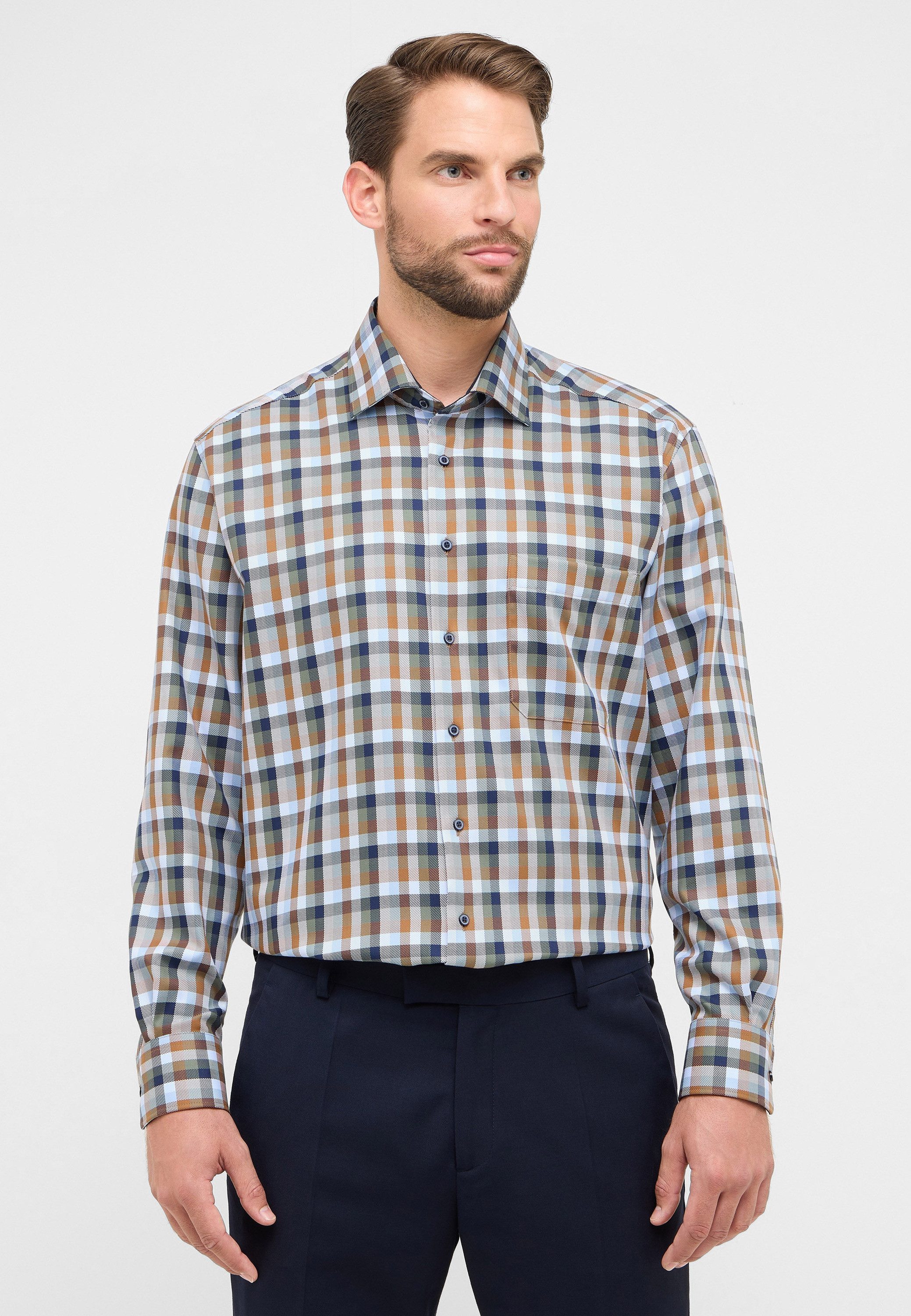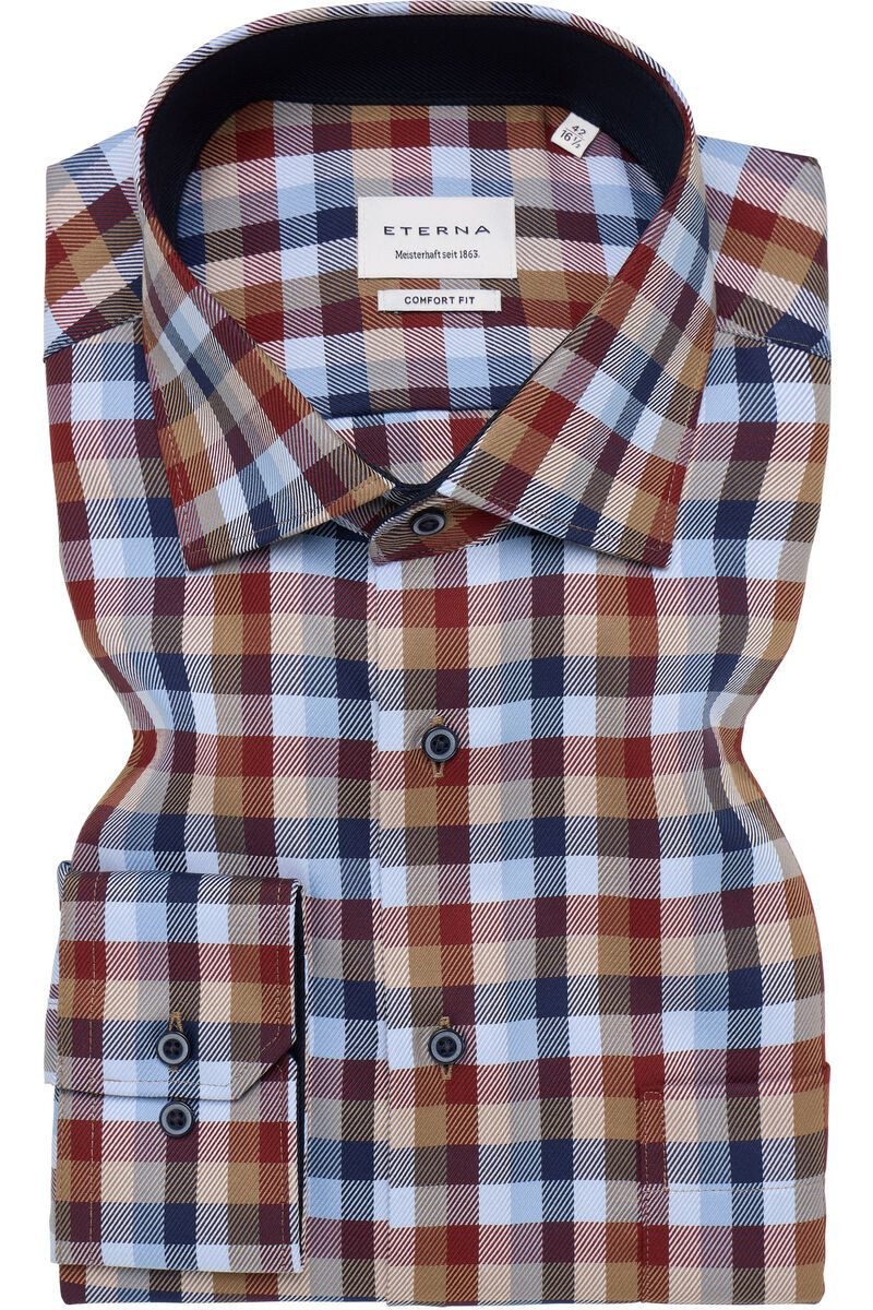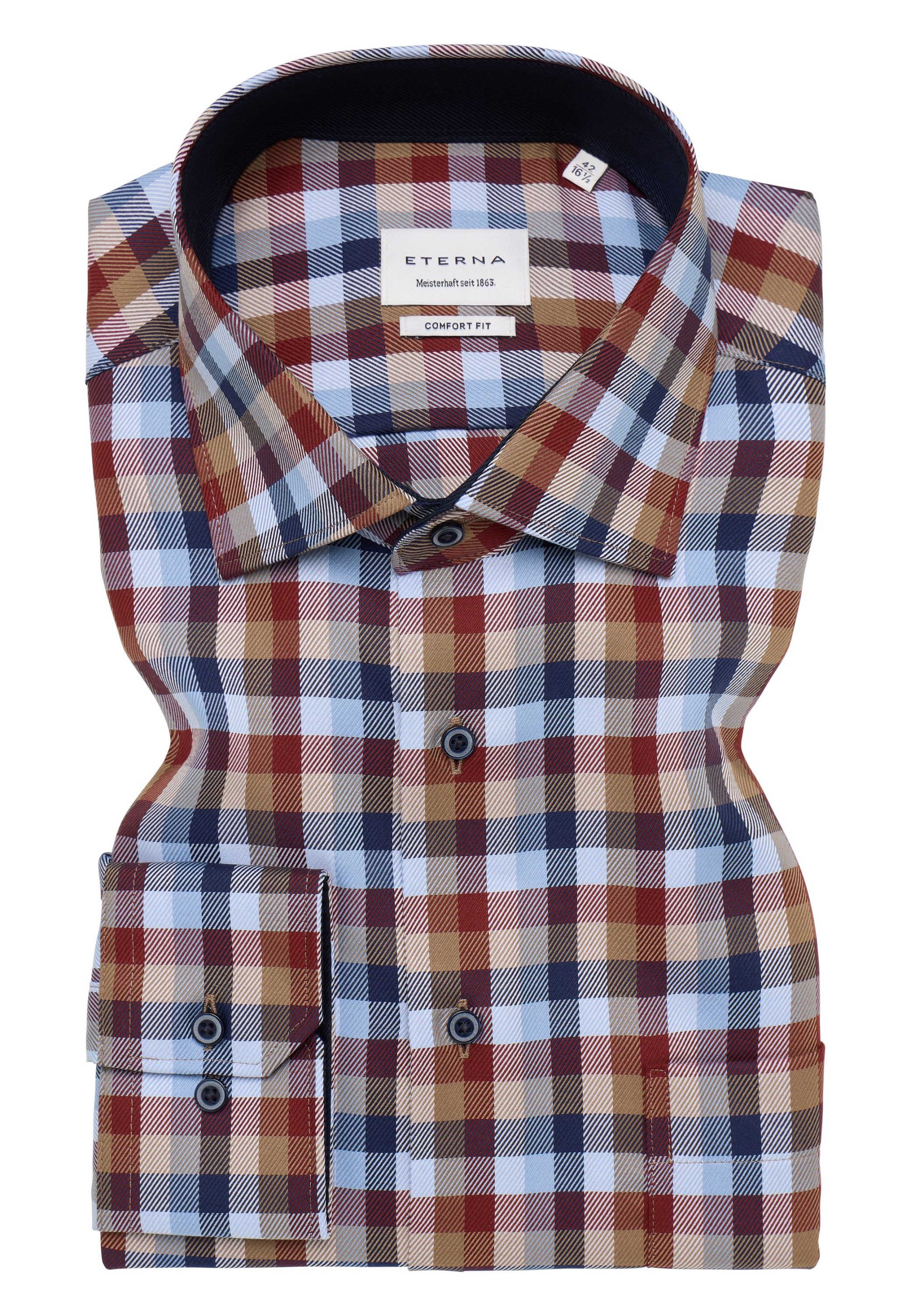 Mit seiner bequemen Passform bietet es viel Bewegungsfreiheit und ist auch in großen Größen erhältlich. Das farblich abgestimmte Karo in Blau-, Braun- und Rottönen macht dieses Hemd zum vielseitigen Begleiter für Business, Freizeit und besondere Anlässe.