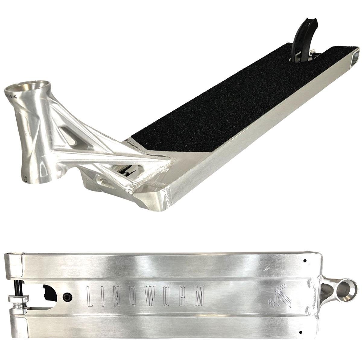 Das neue Ethic Lindworm V4 Deck überzeugt ebenso wie sein Vorgänger mit beindruckender Qualität. Mit der vierte Generation des allseits bekannten Street-Decks bringt Ethic das "Lindworm" noch einmal auf die nächste Ebene. Das 60cm x 15cm große Deck wurde extrudiert und besteht aus der, für Stabilität und hohe Belastbarkeit, bekannten Aluminiumlegierung Aluminium 6061 welche mit einem speziellen Wärmebehandlungsverfahren gefestigt und haltbar gemacht wurde. Der Lenkkopf ist aus einem Stück geschmiedet und weißt daher eine hohe Materialstabilität auf. Insgesamt wurde der Lenkkopf um 9% verstärkt und hat einen Lenkkopfwinkel von 83,5°. Das Deck im klassischen "Box-Cut" Design ist mit zwei hochwertig hergestellten Deck-Enden aus dem leichten und robusten Aluminium 7075 ausgestattet und bietet dir volles Vertrauen beim tricksen und fahren auf der Straße. Das optisch und qualitativ herausragende Lindworm V4 Deck beinhaltet außerdem eine verstellbare Bremse aus Nylon mit einer integrierten Stahlplatte (110,120mm) sowie zwei Sets Achsen in den beiden Größen 12STD (12mm) und 8STD (8mm). Das Deck ist Kompatibel mit Max. 125mm großen und 30mm breiten Rollen.