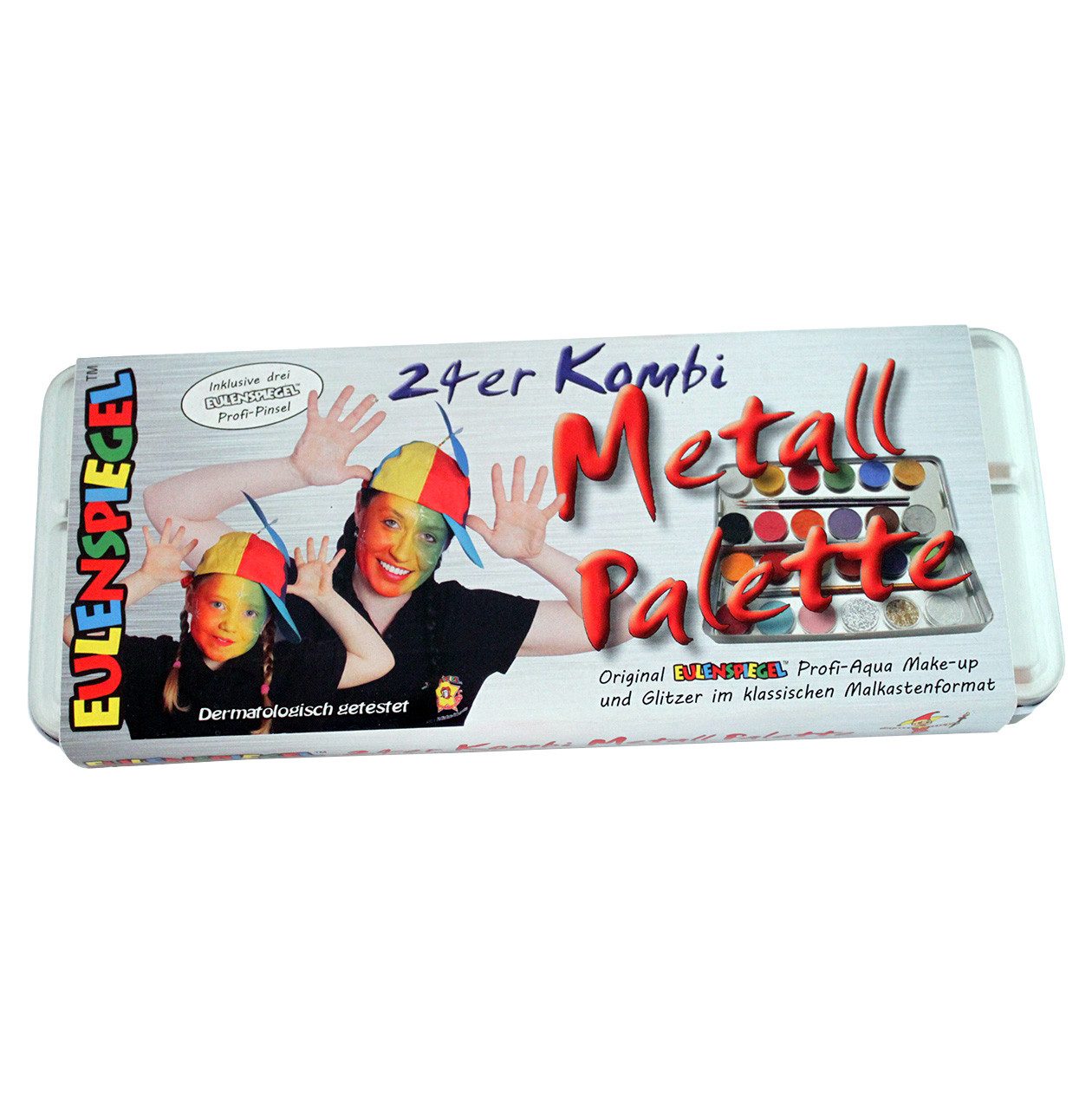 Eulenspiegel 24 Profi Aqua & Glitzer Metall-Palette – Brillante Farben & Glitzer für kreative Make-up-Kunst Erlebe professionelle Schminkkunst in ihrer farbenfrohesten Form mit der Eulenspiegel Profi Aqua & Glitzer Palette im edlen Metalletui! Diese umfangreiche Schminkpalette ist ein Muss für alle Make-up-Fans, Face-Painting-Profis und kreative Künstler:innen – ideal für Fasching, Halloween, Kinderschminken, Theater, Karneval oder fantasievolle Looks auf Events und Bühnen. Die Palette enthält 21 intensive Profi-Aqua-Farben à 3,5 ml – von klassischen Tönen wie Weiß, Schwarz, Pink und Braun bis hin zu leuchtenden Nuancen wie Sonnengelb, Smaragdgrün, Himmelblau oder Weinrot. Ergänzt wird das Set durch 3 funkelnde Glitzerpuder à 2 g in Silber, Gold und Perlmutt, mit denen du Highlights setzen und deine Looks veredeln kannst. Dank der wasserlöslichen Rezeptur lassen sich die Farben ganz einfach mit einem feuchten Schwämmchen oder Pinsel auftragen und rückstandslos mit Wasser und Seife entfernen. Das Set ist vegan, dermatologisch getestet, glutenfrei und frei von Nussölen – ideal auch für empfindliche Haut und Kinderschminken. Verpackt ist alles in einem robusten und stilvollen Metalletui, das sowohl die Farben als auch die drei hochwertigen Profi-Pinsel sicher aufbewahrt – ideal für unterwegs oder den professionellen Einsatz. Deine Vorteile auf einen Blick: 21 Aqua-Farben à 3,5 ml – leuchtend, deckend & mischbar, inkl. Perlglanz-Farben 3 Glitzerpuder à 2 g – für glänzende Akzente in Silber, Gold & Perlmutt 3 Profi-Pinsel – ideal für feine Linien, Flächen und kreative Effekte Wasserlöslich & leicht entfernbar – einfache Anwendung ohne Hautreizungen Vegan & hautfreundlich – dermatologisch getestet, ohne Tierversuche Edles Metalletui – ideal zum Mitnehmen, schützt Farben & Pinsel sicher Made in Germany – Qualität & Sicherheit nach höchsten Standards Perfekt für viele Anlässe: Kinderschminken auf Geburtstagen & Festen Halloween- & Faschings-Make-up Theater- und Bühnenmasken Kreative Bodypainting-Projekte Fotoshootings & Motto-Partys Mit der Eulenspiegel Profi Aqua & Glitzer Palette holst du dir alles, was du für professionelle Schminklooks brauchst – kompakt, vielseitig und in höchster Qualität. Ob Anfänger:in oder Make-up-Profi: Mit dieser Palette sind deiner Fantasie keine Grenzen gesetzt!