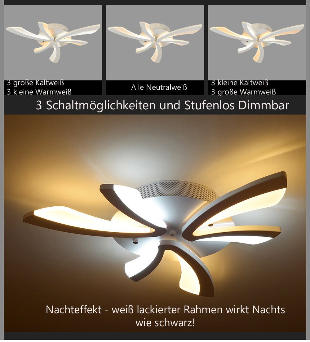 Sie können die Lichtfarbe einstellen. 1 Einstellung, Warmweiß und Kaltweiß, 2. Einstellung Neutralweiß, 3. Einstellung Kaltweiß und Warmweiß.. Lassen auch Sie sich von dieser modernen LED-Deckenleuchte verführen und genießen Sie die angenehmen, entspannenden Farb- und Lichtspiele. Neben diesen ganzen Highlights sticht die Lampe mit ihrem modernen Design hervor.