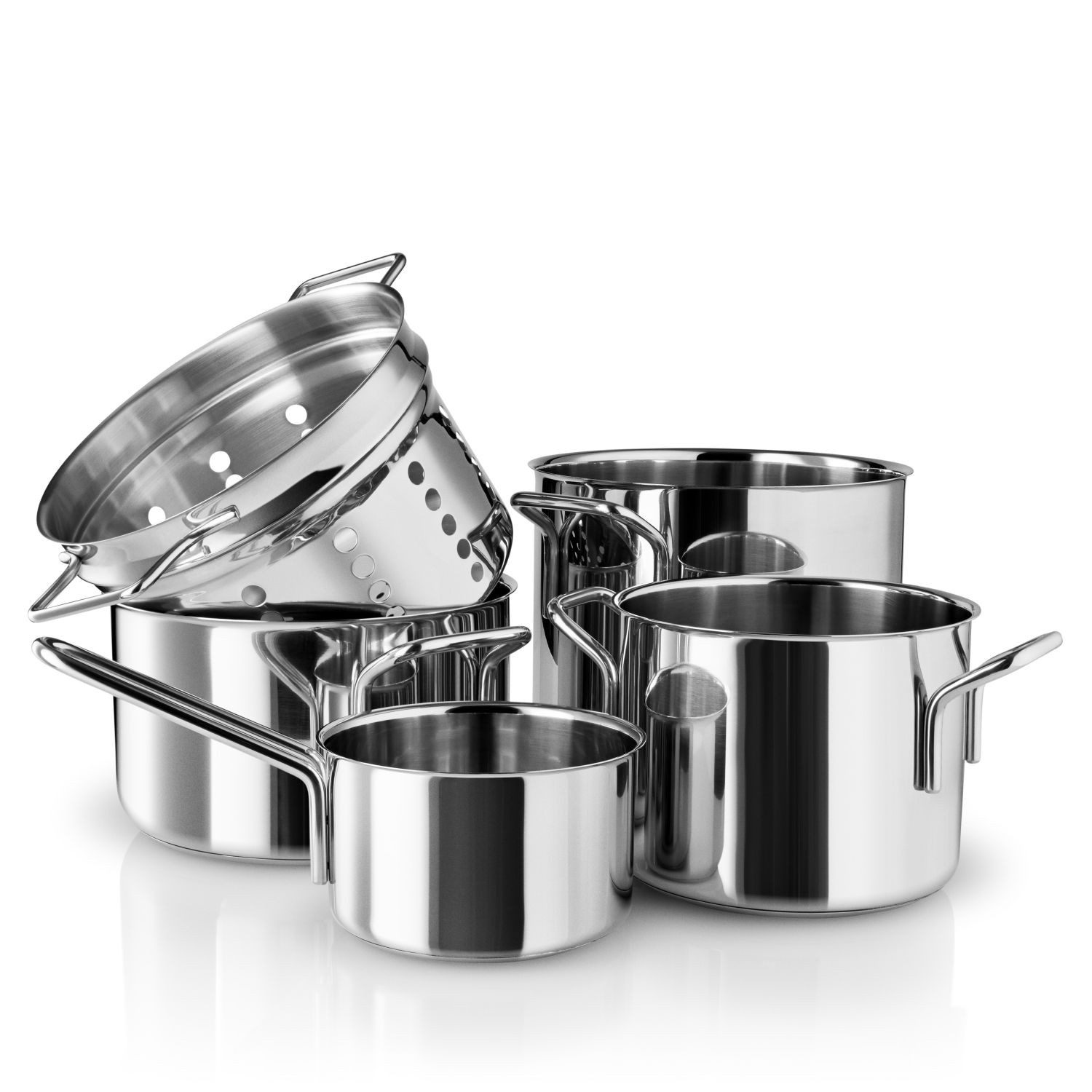 Das praktische Topfset von Eva Solo besteht aus fünf Teilen, die garantiert den Alltag erleichtern. Die harmonische Verschmelzung von Form und Funktion hat das aus Edelstahl bestehende Topfset zu einem modernen Design-Klassiker gemacht. Всі Teile sind äußerst robust und vertragen hohe Temperaturen. Edelstahl ist für den alltäglichen Gebrauch geeignet und kann in der Spülmaschine gereinigt werden. Das Set besteht aus einer Kasserolle (Volumen 1,1 L, Ø 13 cm), einem kleinen Topf (Volumen 2,2 L, Ø 16 cm), einem mittelgroßen Topf (Volumen 3,6 L, Ø 20 cm), einem großen Topf (Volumen 4,8 L, Ø 20 cm) und einem Pasta-Einsatz zum bequemen Abseihen von frisch gekochten Nudeln. Die Töpfe sind sowohl für Glaskeramik-, Gas- und Elektroherde sowie für Induktionsherde geeignet. Passende Deckel sind separat erhältlich.