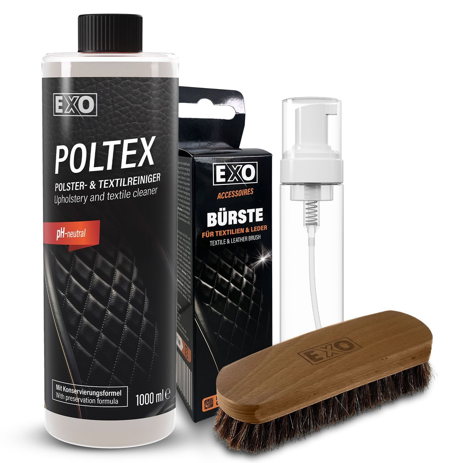 Neutralreiniger für die schonende Reinigung und Pflege von Leder-, Alcantara- und Textilstücke. EXO POLTEX ist speziell entwickelt, um eine effektive und gleichzeitig materialschonende Reinigung zu gewährleisten. Ob es sich um Polstermöbel, Teppiche, Autositze oder andere Textilien handelt, dieses Produkt garantiert eine gründliche und sichere Reinigung. Vielseitige Anwendungsmöglichkeiten: Ideal für Leder: Erhalten Sie die Natürlichkeit und Geschmeidigkeit von Lederprodukten. Alcantara: Speziell abgestimmt, um die empfindlichen Alcantara-Oberflächen effektiv zu reinigen. Textilien: Geeignet für Polster, Teppiche und andere textile Oberflächen, ohne die Faserstruktur zu beeinträchtigen. Einfache und Effiziente Anwendung: Verdünnungsverhältnis: Je nach Verschmutzungsgrad kann unser Produkt in einem Verhältnis von 1:5 bis 1:20 mit Wasser verdünnt werden. Auftragen: Nutzen Sie einen Foamer, eine Sprühflasche oder ein Microfasertuch, um das verdünnte Produkt aufzutragen. Einwirkzeit: Lassen Sie es kurz einwirken, um Schmutz und Flecken effektiv zu lösen. Bearbeitung: Arbeiten Sie das Produkt mit einem Schwamm, Microfasertuch oder Pinsel vorsichtig in Richtung der Hauptfaser ein. Restentfernung: Überschüssige Produktreste können einfach mit einem feuchten Tuch oder einem Nass-Trockensauger entfernt werden. Für die optimale Anwendung des EXO POLTEX Neutralreinigers enthält das Set einen Foamer mit schaumproduzierendem Sprühkopf, der eine gleichmäßige und effiziente Verteilung des Reinigers ermöglicht. Der dichte, stabile Schaum sorgt für eine gründliche Reinigung und erleichtert die Anwendung. Das Set enthält außerdem eine EXO Handbürste, die für die Reinigung aller Oberflächen wie Leder, Wildleder, Nubuk und Textilien geeignet ist. Dank der ergonomischen Griffmulde liegt die Bürste besonders gut in der Hand und ermöglicht eine präzise, materialschonende Reinigung.