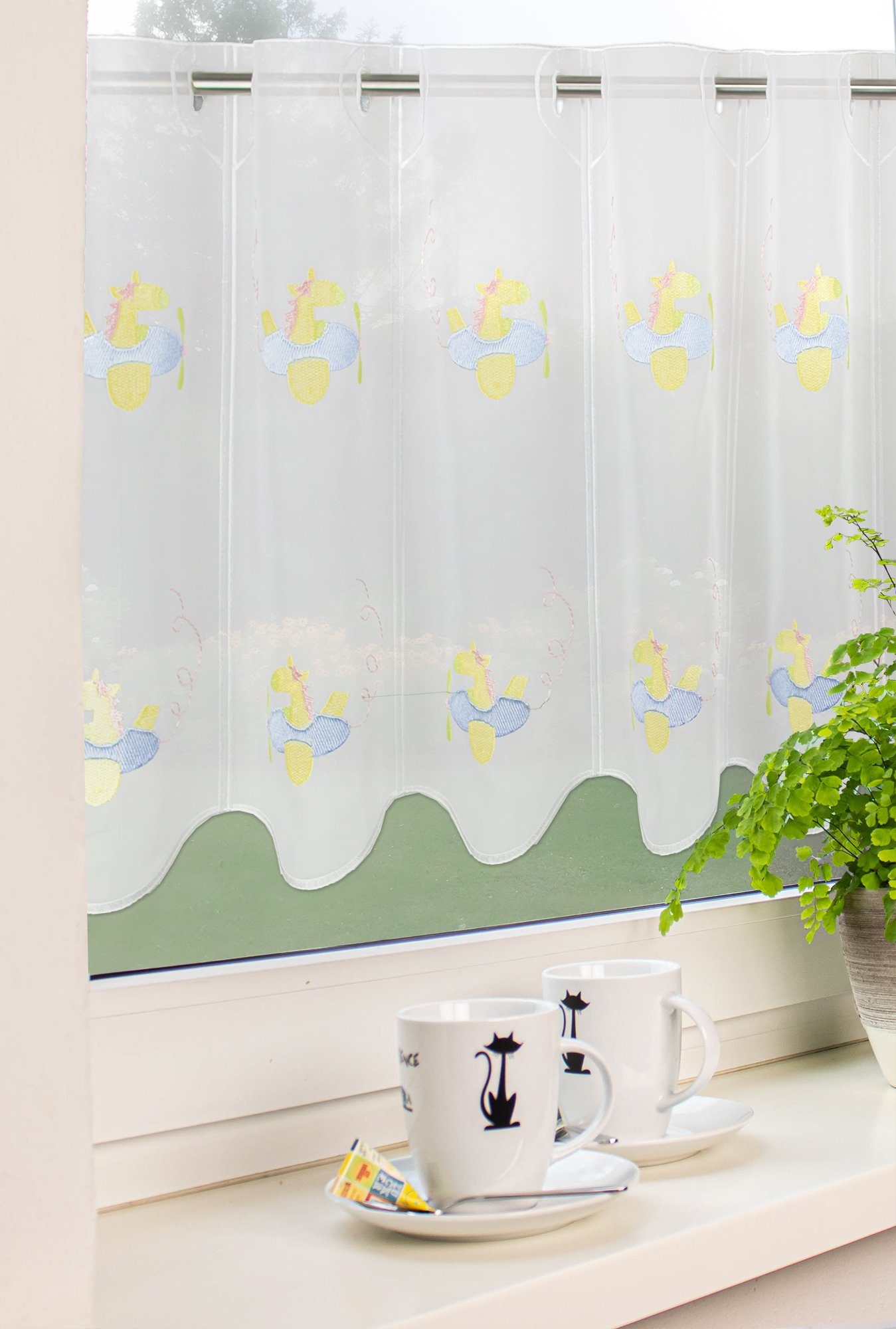 Hochwertige Kindergardine mit 2 Pferden die ein Flugzeug fliegen. Die fliegenden Flugzeuge und Pferde sind eine Pentamatstickerei in den Farben Rosa, Gelb und Hellblau.