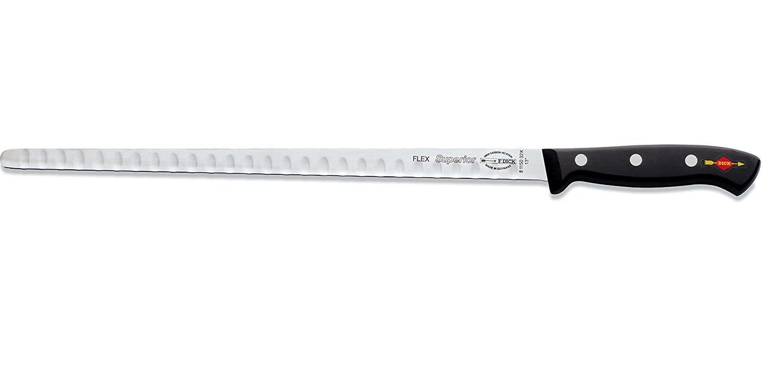 Aufgeschnittener Lachs oder Schinken sieht schöner aus und schmeckt vor allem besser, wenn er hauchdünn aufgeschnitten ist. Das Lachs-/Schinkenmesser aus der Serie Superior ist deshalb mit einer 32 cm langen und flexiblen Klinge ausgestattet, mit der Sie Fisch und Schinken perfekt aufschneiden. Die Superior Serie ist für den Einsatz im professionellen Bereich konzipiert. Klassisches Design mit Griffnieten und die leichte Ausführung ergeben ein Messer in morderner Form und Funktion. Klinge und Griff sind ohne Spalt fest miteinander verbunden, dank dem durchgehenden Stahl bis zum Griffende wird eine hohe Stabilität erreicht. Das Nachschärfen der gesamten Schneide ist möglich. Klinge ist aus X55CrMo14 Stahl. Die ausgewogene Härte von 56° HRC ist der ideale Kompromiss für perfekte Schnitthaltigkeit und leichtes Nachschärfen. Made in Germany.