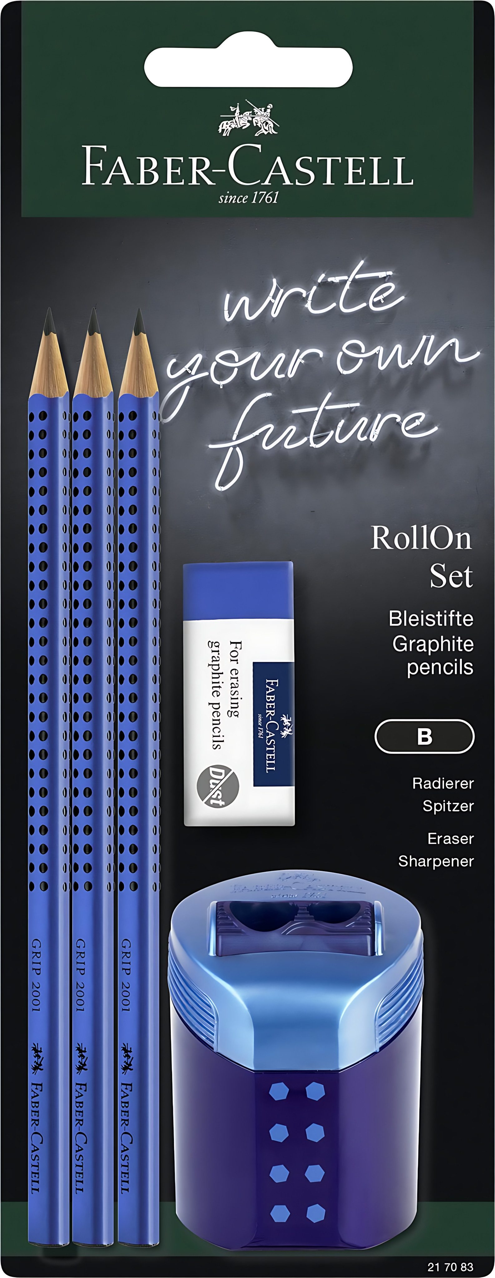 Bleistiftset GRIP 2001. ideale Ausstattung für Prüfungen, inkl. Bleistift, Spitzer und Radiergummi. Ausführung Stift: Ausführung der Schaftform: ergonomische Dreikantform, Härtegradkennzeichnung vorhanden, Bezeichnung der Härte: B, Ausführung des Spitzzustandes: gespitzt. Ausführung Schaft: Schaft lackiert, Lackierung auf Wasserbasis gegeben, Farbe des Schaftes: blau. Art der Verpackung und Inhalt: Ausführung der Lieferzusammenstellung: Bleistifte, Radierer und Spitzdose.Art der Verpackung: Blisterkarte. Ausführung des Inhalts mit Packung: Blisterkarte