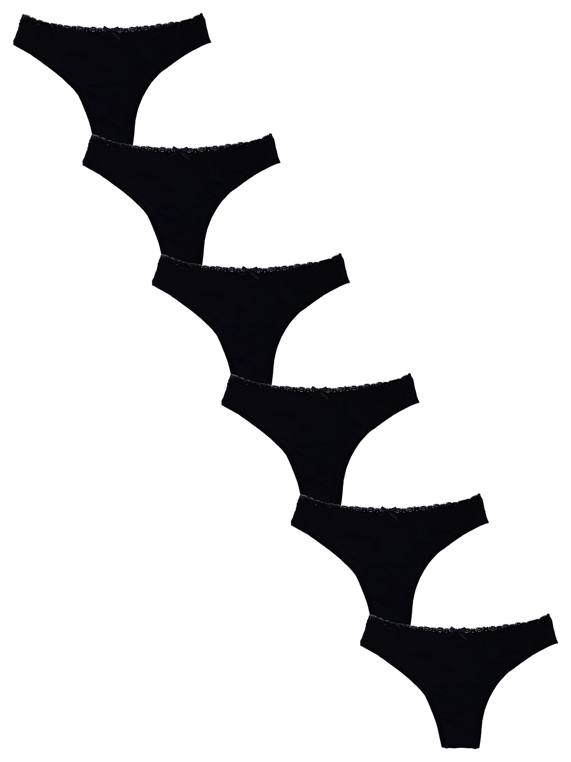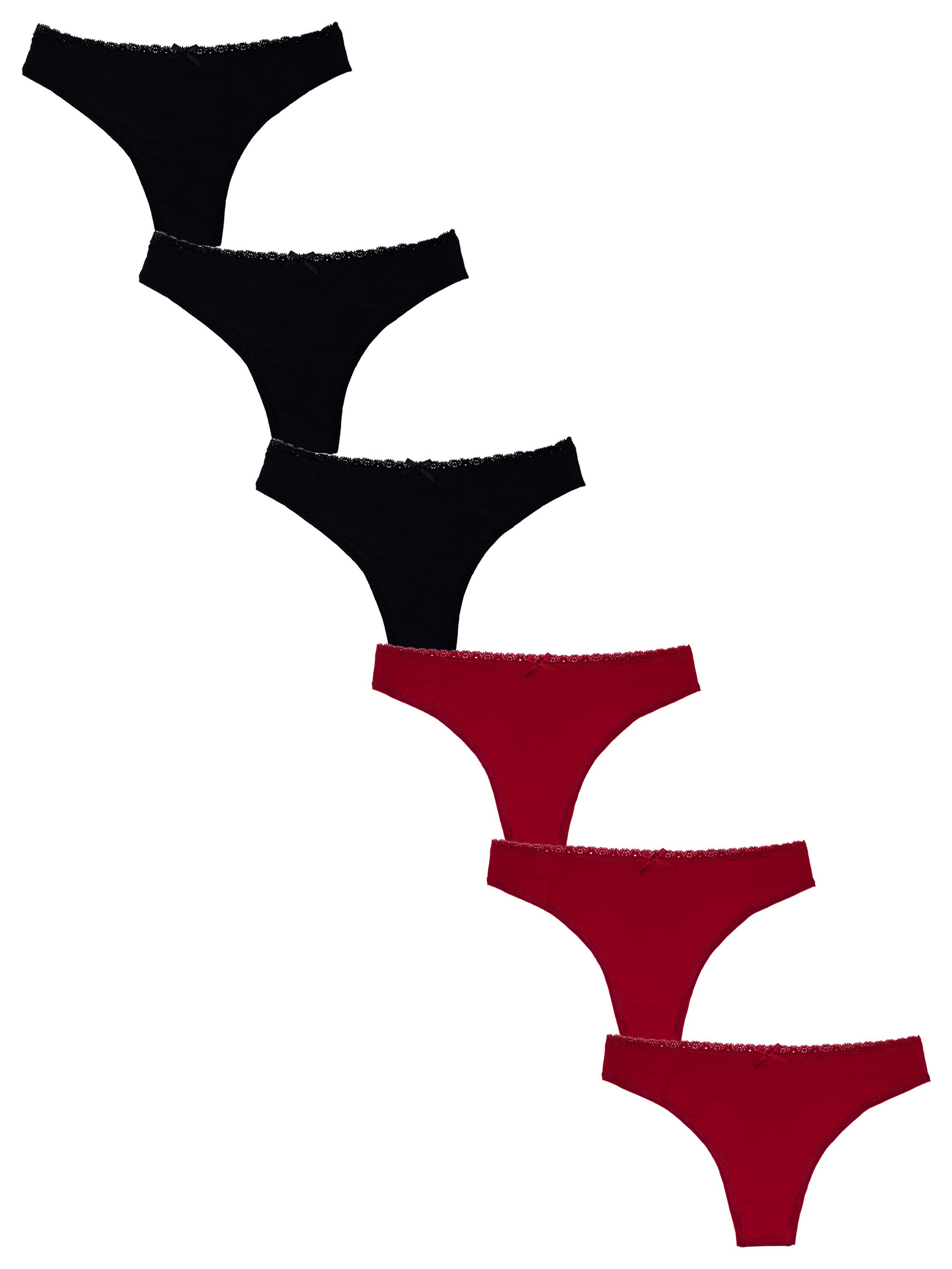 Schlicht und trotzdem verspielt, diese modischen Damen-Höschen im hüftig sitzenden, modernen String-Fit zeigen, dass schon ein durchdachter Schnitt und eine gute Passform einen echt verführerischen Look kreieren können. Mit dem verspielten Spitzenbund sowie dem dezenten Schleifchen, kannst du dich jederzeit feminin sexy fühlen. Puristinnen greifen sicherlich spontan zu den schicken 6er-Sets mit den Modellen in elegantem Schwarz. Wer farblich auf etwas Abwechslung im Alltag steht, wählt den pfiffigen Farbmix mit sechs der attraktiven Höschen in Farbnuancen Dunkelrot und Nachtschwarz.