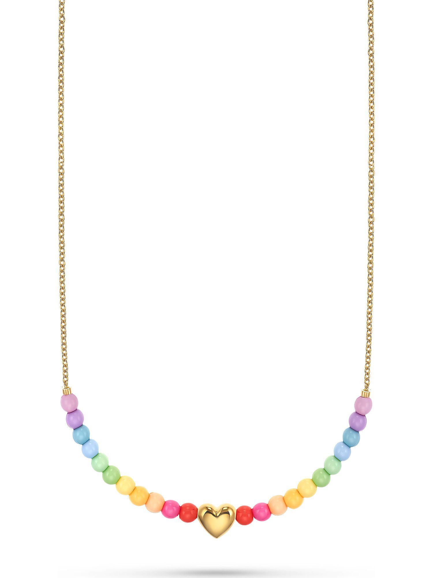 Ein Traum von einem Farbenmix ist diese Halskette für Jungs und Mädchen von FAVS LITTLE FRIENDS. Das goldfarbene Silber verleiht der Kette und dem herzförmigen Anhänger einen sehr erwachsenen Touch, der aber im Handumdrehen von fröhlichen Kunstharzperlen abgelöst wird. Diese leuchten in allen Farben des Regenbogens und stehen für Leichtigkeit und Spaß. Als Geschenk erinnert diese Halskette gern an schöne Events und spannende, gemeinsam erlebte Abenteuer.