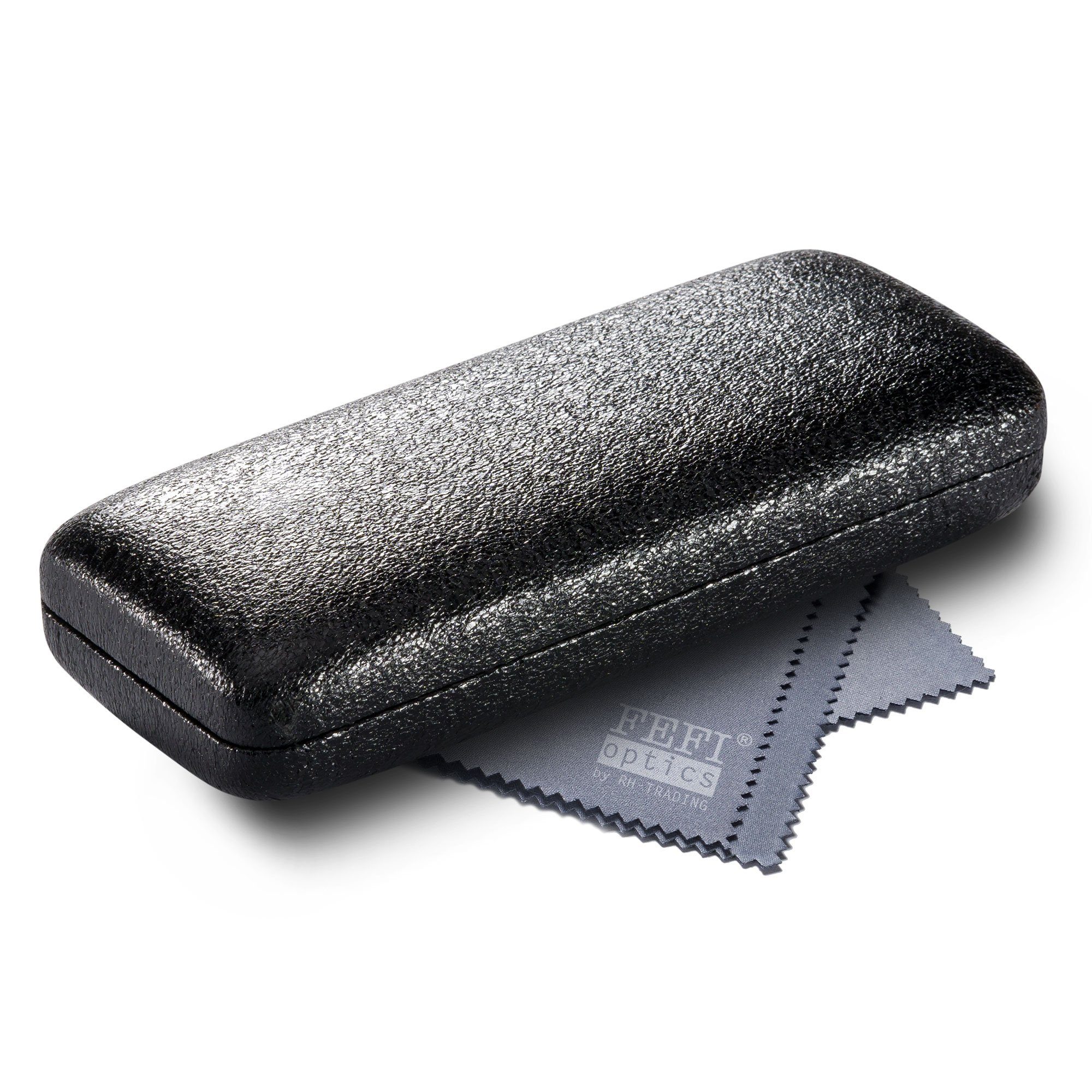 Sicheren Schutz für Ihre Brille garantiert dieses wunderschöne Hardcover Etui, und dazu sieht es noch extrem nice aus. Das Etui ist sehr sorgfältig verarbeitet und schützt Ihre wertvolle Brille. Der Schnappverschluss hält Ihr Etui sicher geschlossen - bei Bedarf lässt es sich leicht öffnen. Innen sorgt ein schwarzer, samtartiger Bezug dafür, dass es keine Kratzer gibt und Sie lange Freude an diesem tollen Etui haben werden. Im Set mitgeliefert, wird ein hochwertiges Mikrofasertuch in Optikerqualität, das sich wohlwollend von oft hauchdünnen, billigen anderen Tüchern unterscheidet.