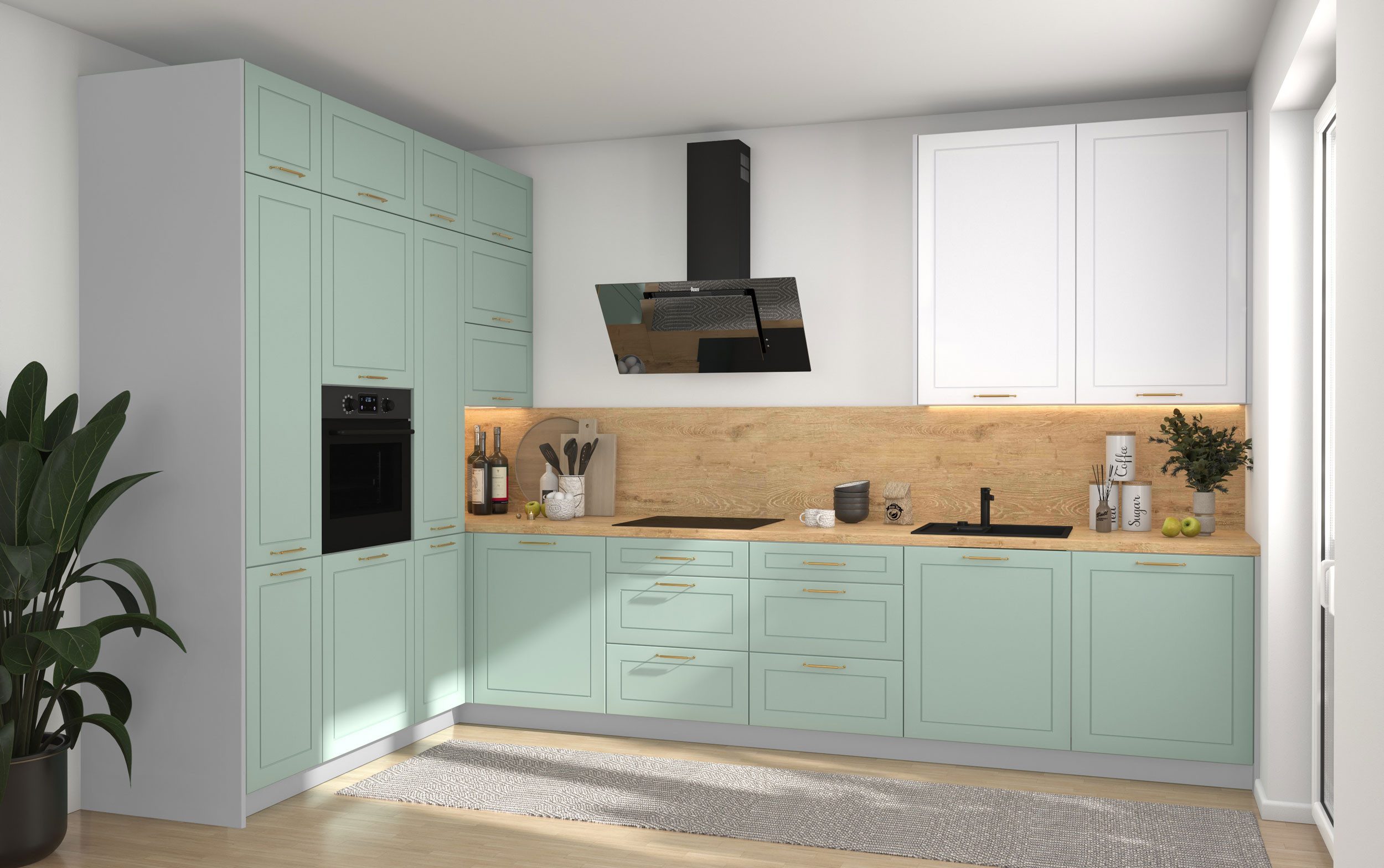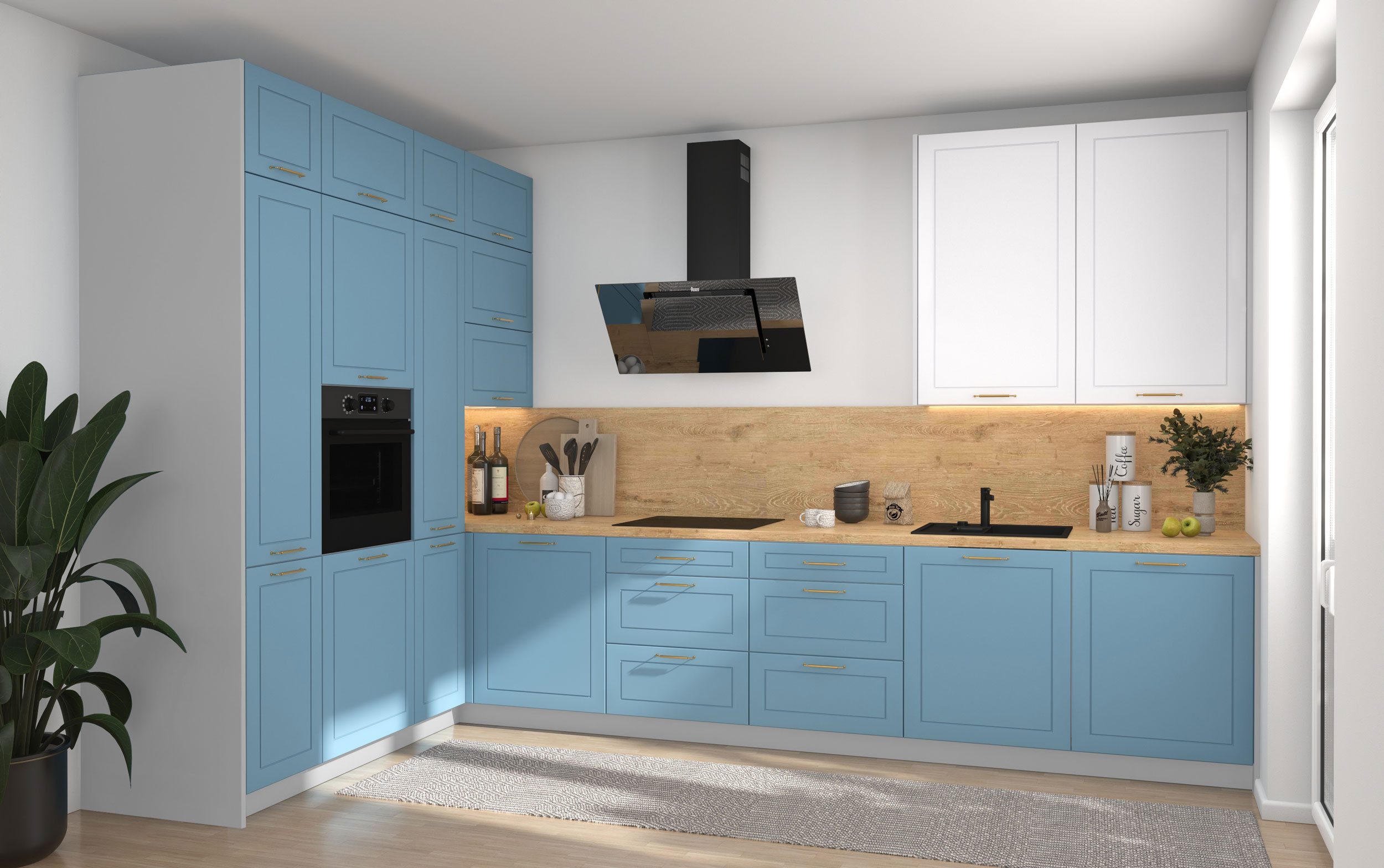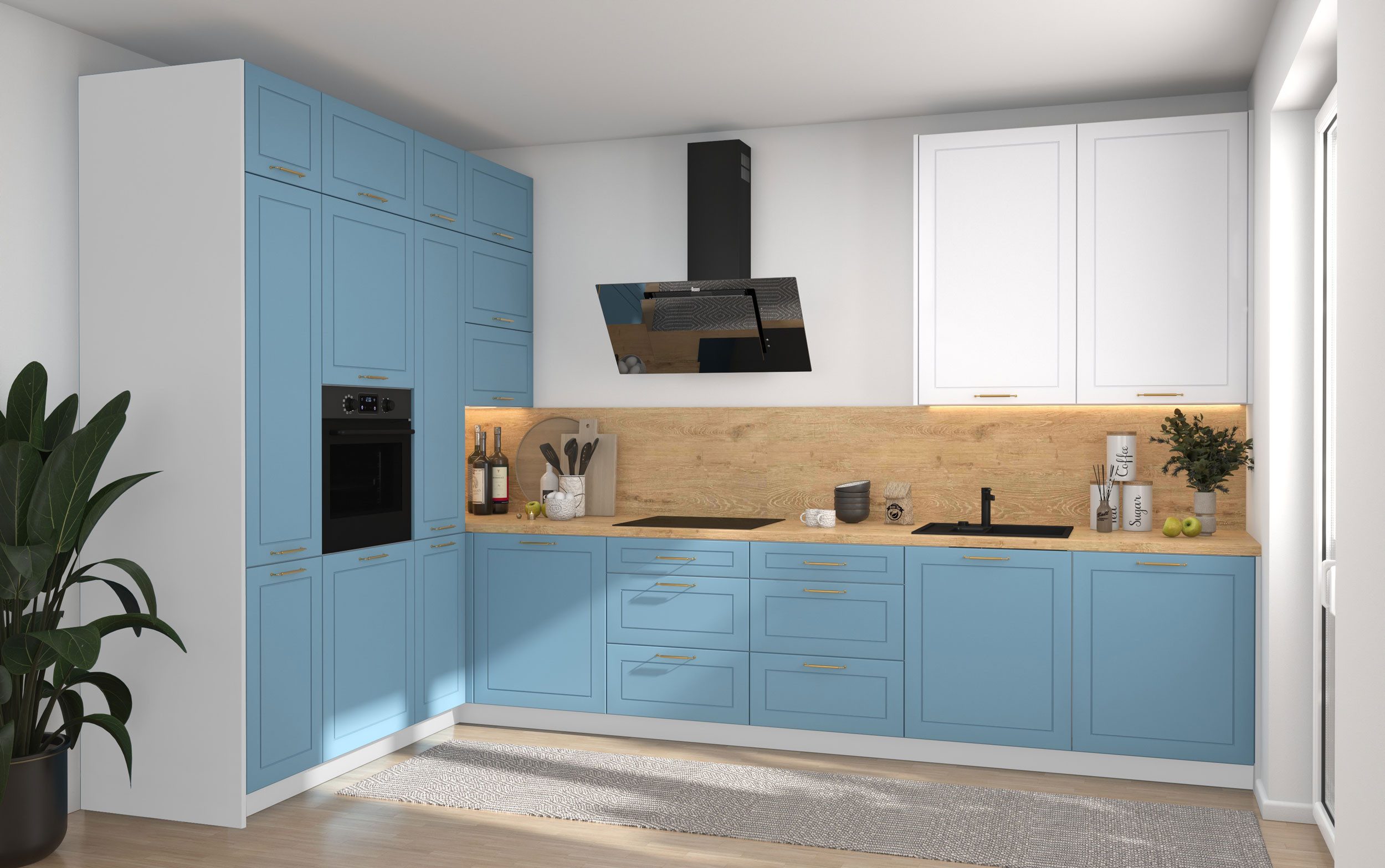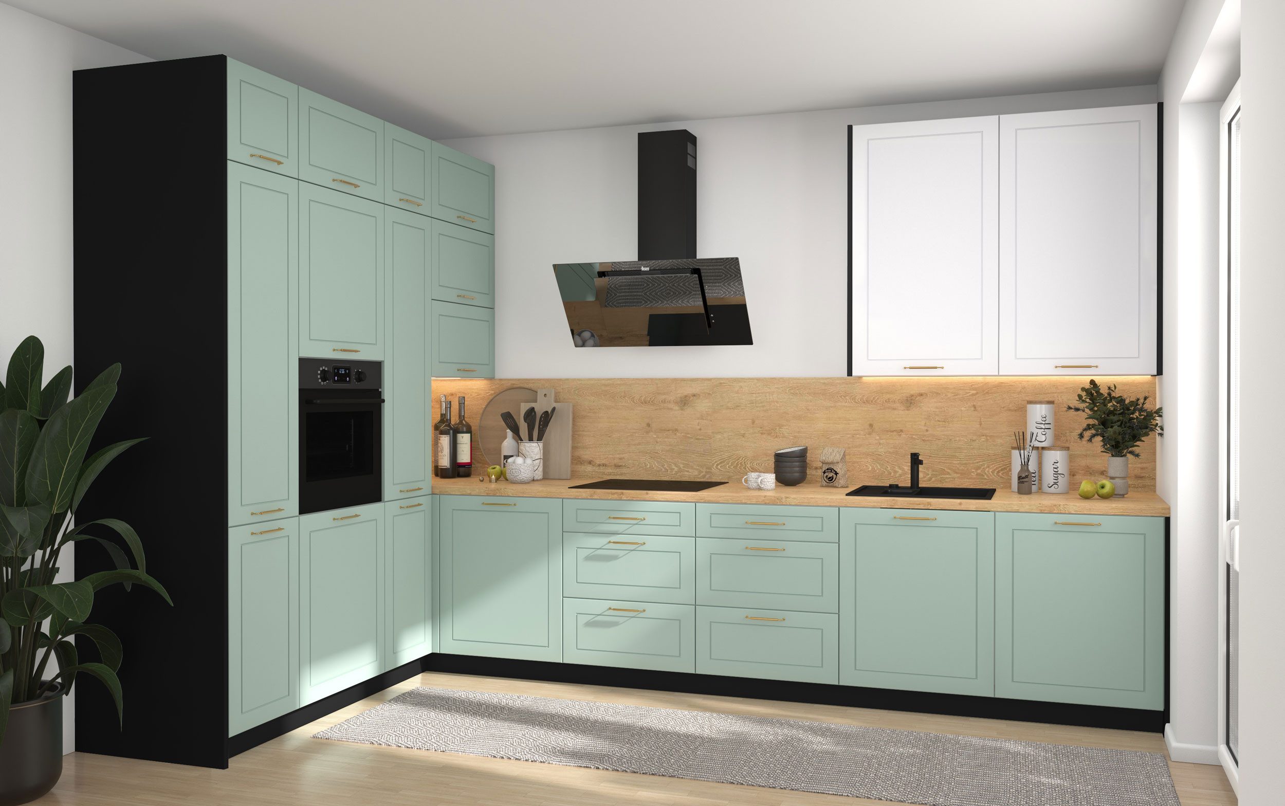 Set beinhaltet | 5x Hängeschränke, 3x Aufsatzschränke, 1x Eckverbindungsschrank, 2x Schubladenunterschränke, 1x Spülenunterschrank, 1x Geschirrspülerfront, 1x Backofenumbauschrank, 2x Apothekerschränke |