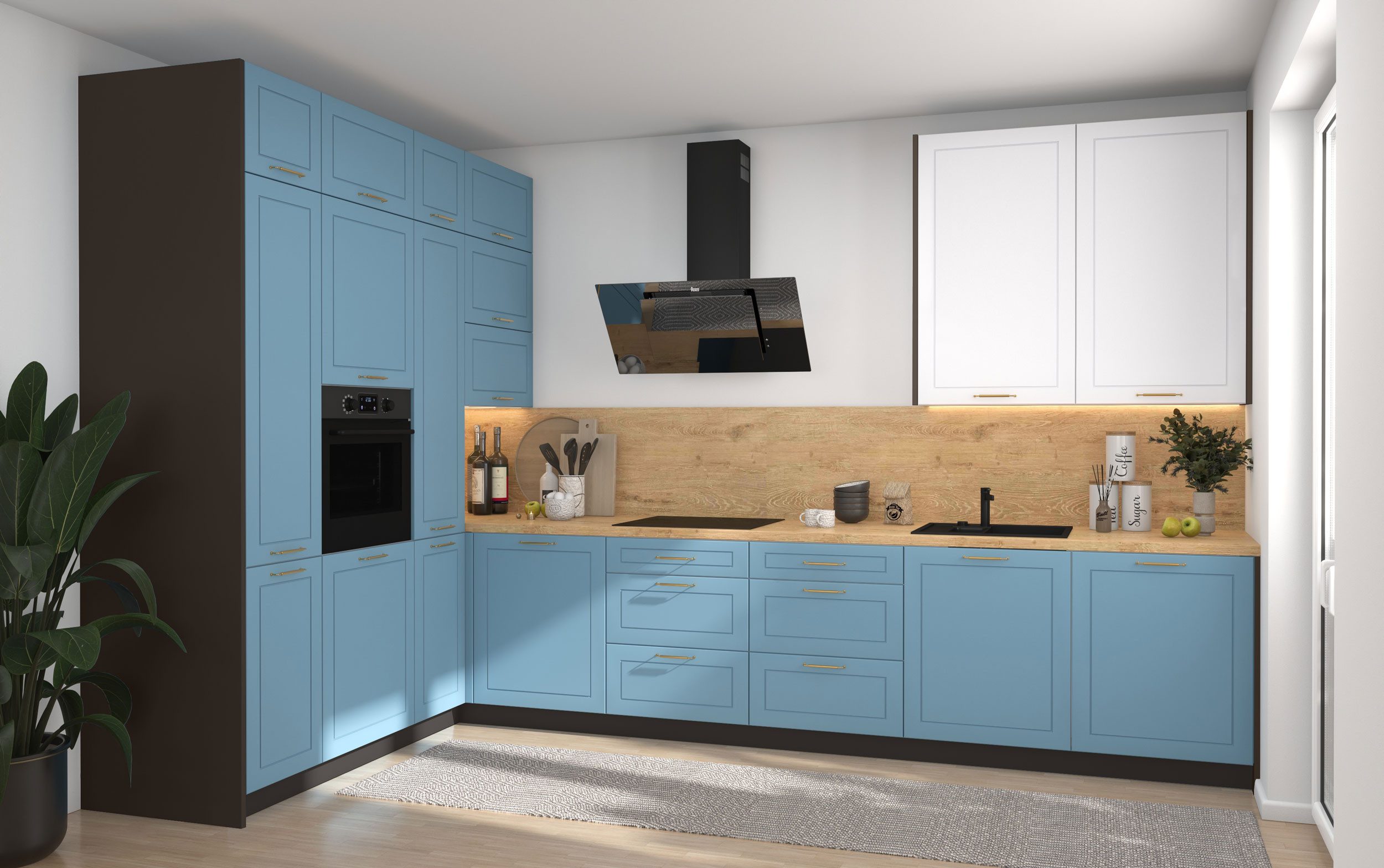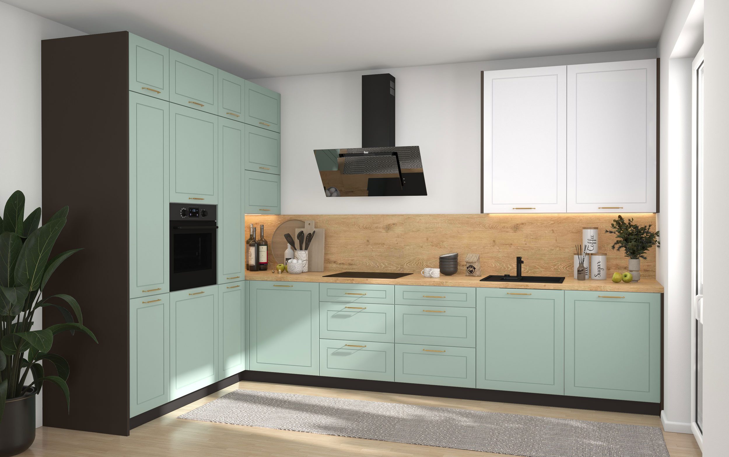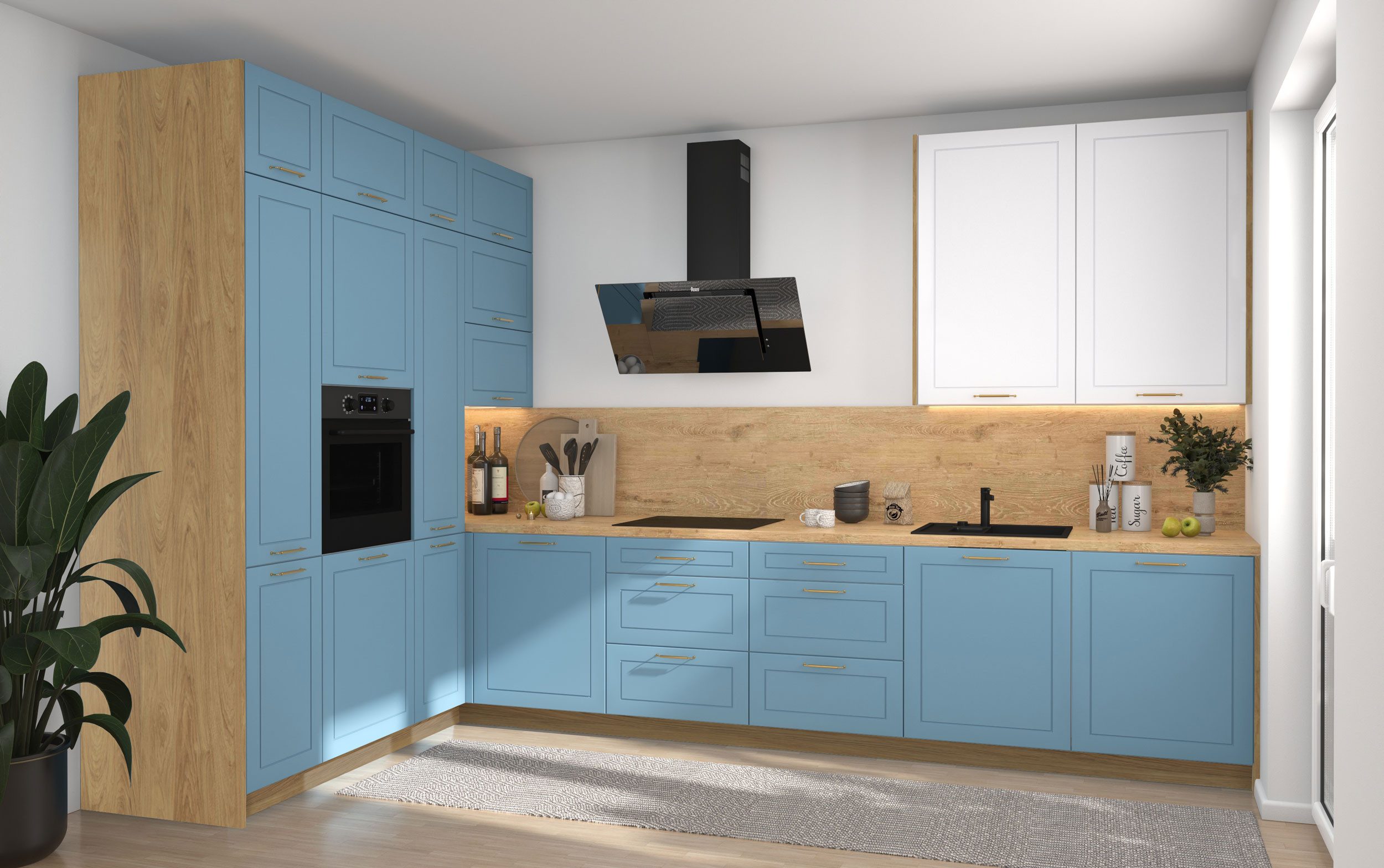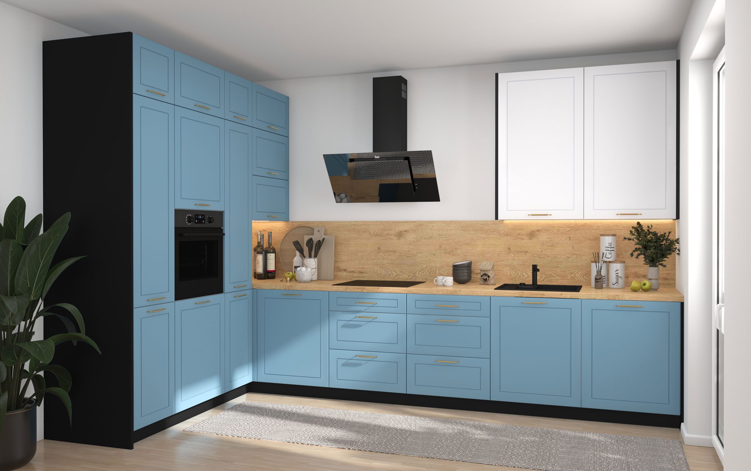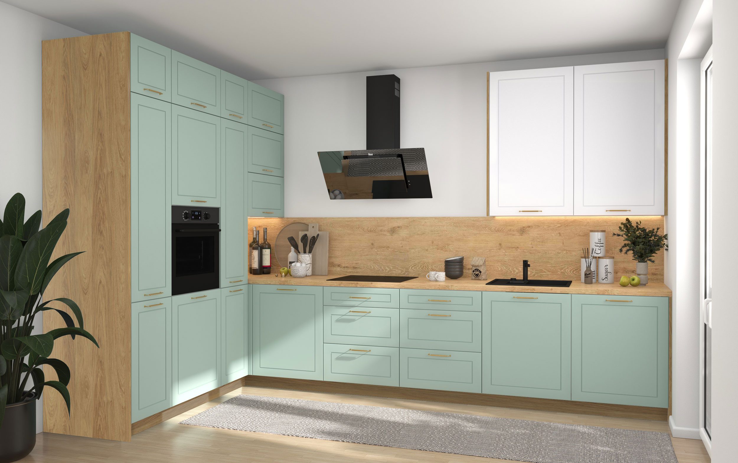 Set beinhaltet | 5x Hängeschränke, 3x Aufsatzschränke, 1x Eckverbindungsschrank, 2x Schubladenunterschränke, 1x Spülenunterschrank, 1x Geschirrspülerfront, 1x Backofenumbauschrank, 2x Apothekerschränke |