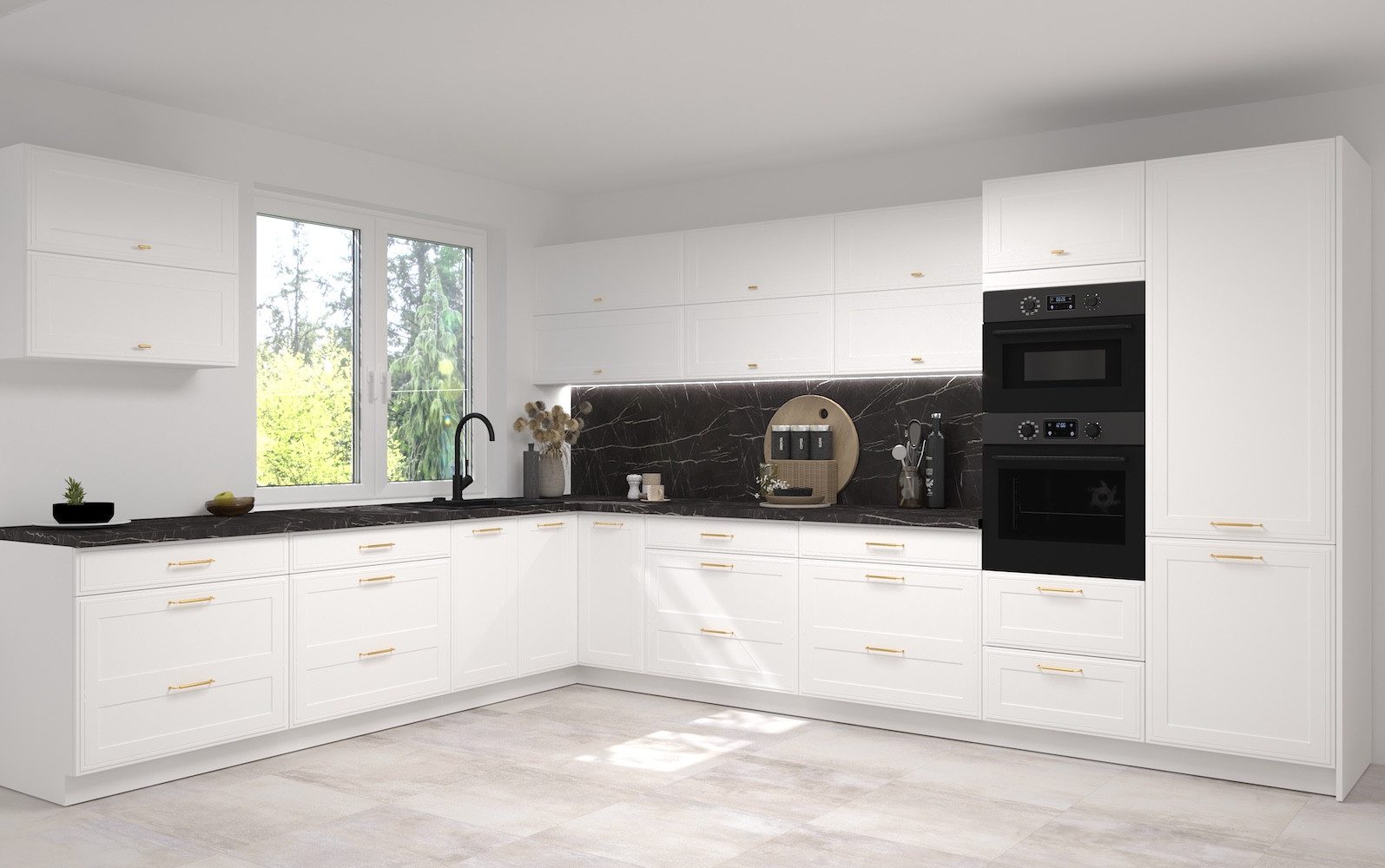Set beinhaltet | 4x Klapphänge-, 3x Schubladenunter-, 1x Spülenunter-, 1x Eckverbindungs-, 1x Backofenumbau-, 1x Kühlumbau-, 1x Geschirrspülerfront, 1x Abschlussrahmen |