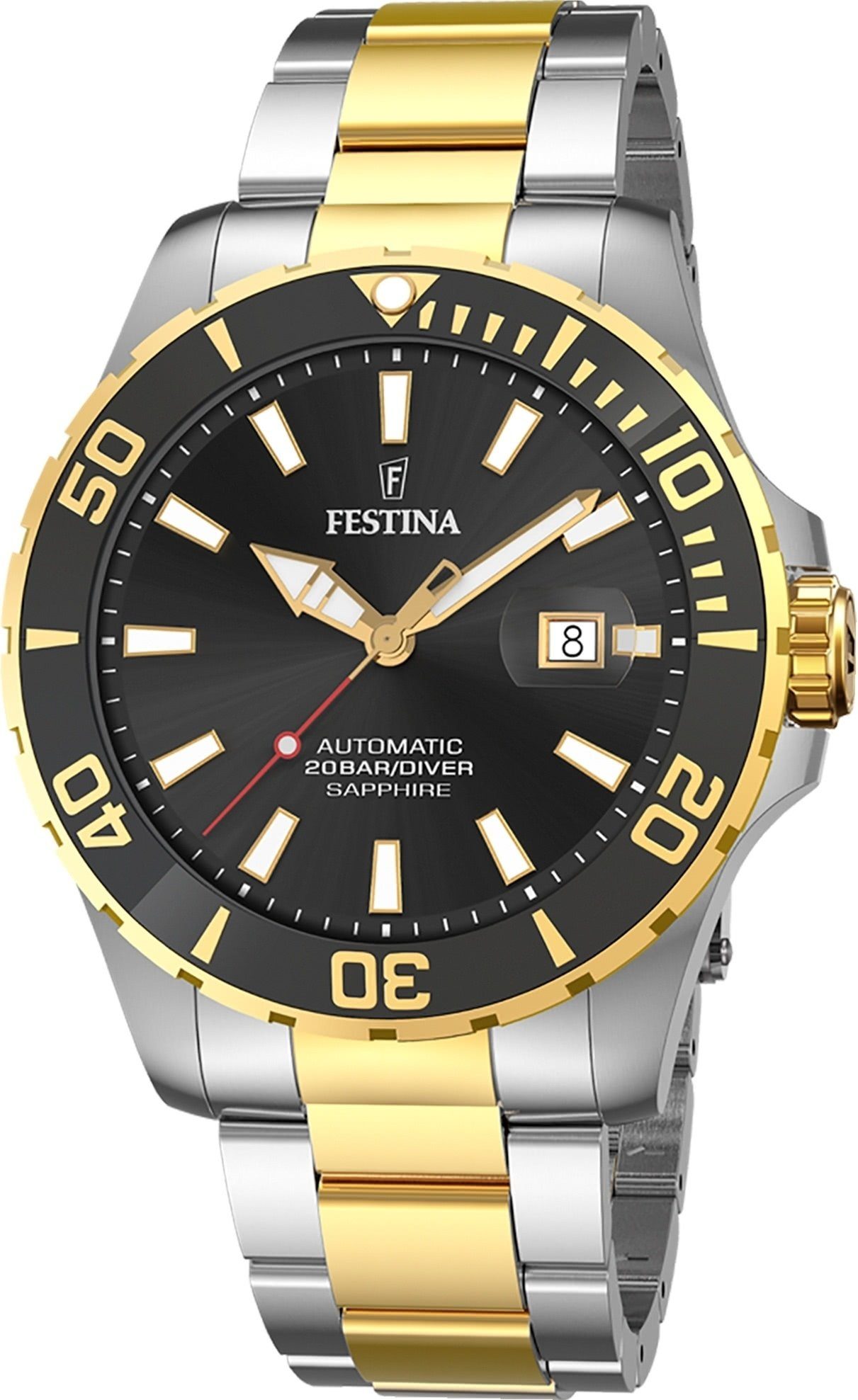 Die Elegant Uhr der Marke Festina hat ein schönes Armband aus Edelstahl in silber gold mit Faltschließe. Eine Uhr aus der Festina Automatik Kollektion für Herren in der Gehäusefarbe schwarz . Die Analoguhr mit Saphirglas hat ein Zifferblatt in der Farbe schwarz. Die Form der Uhr ist rund und das Gehäuse ist groß ca. 44mm.