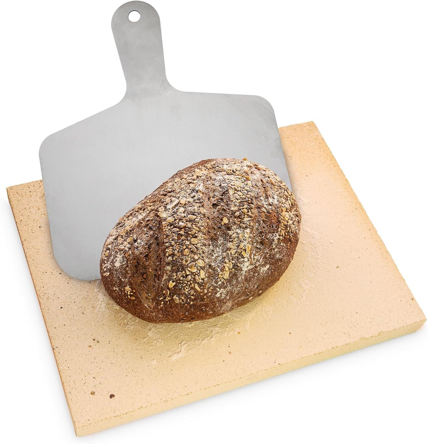 Unser rechteckiger Brotbackstein aus Qualitätsschamotte ermöglicht Ihnen das Erleben von knusprigem Brot wie von Ihrer Lieblingsbäckerei - direkt aus Ihrem Backofen oder vom Grill. Durch seine hervorragende Wärmespeicherfähigkeit und Warmwechselbeständigkeit eignet er sich nicht nur für Brote und Brötchen, sondern auch für Flammkuchen, Pizza, Kuchen und vieles mehr. Der Brotbackstein aus Schamotte ist lebensmittelecht gemäß Verordnung (EG) Nr. 1935/2004 und kann einfach mit klarem Wasser gereinigt werden. Unser Pizzaschieber aus rostfreiem Edelstahl ist langlebig und leicht in der Handhabung und zudem spülmaschinengeeignet.
