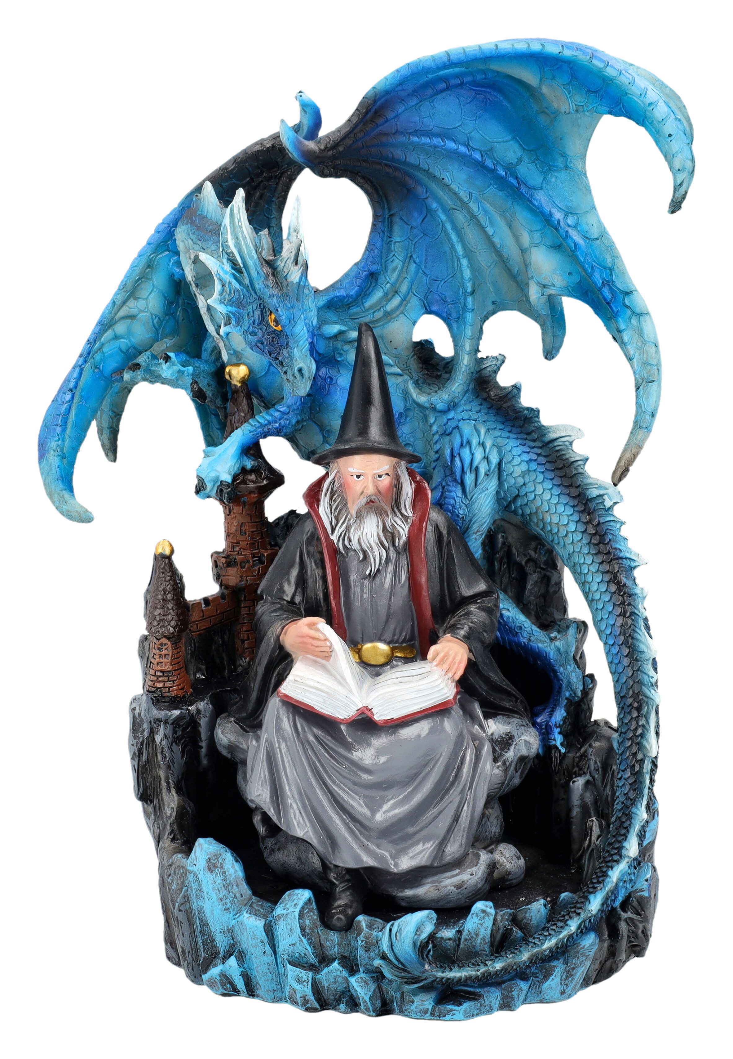 Die Fantasy Statue zeigt einen Magier in langer Robe mit einem großen Zauberbuch, während ein blauer Drache über ihn wacht. Die detailreiche Gestaltung und die handbemalte Farbgebung verleihen der Figur eine besondere Tiefe. Ob als Sammlerstück oder dekorativer Blickfang, diese Magier Statue ist ein echtes Highlight.