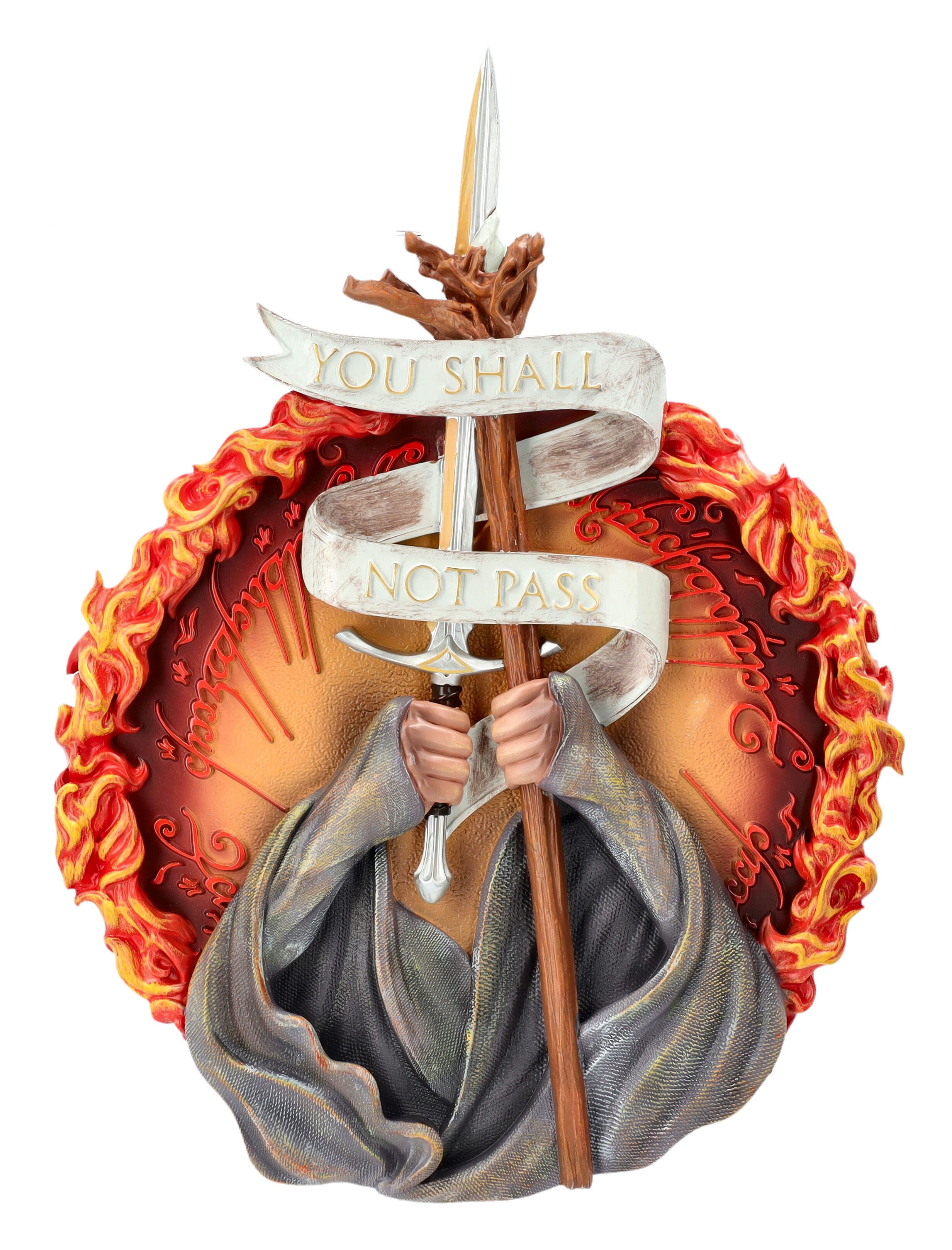 Dieses beeindruckende Wandrelief zeigt Gandalf den Grauen in einer ikonischen Pose: Vor einem flammenden Hintergrund erhebt er Schwert und Zauberstab, um ungebetene Gäste mit den berühmten Worten "You shall not pass" abzuwehren. Die detailreiche Darstellung wurde aus hochwertigem Kunststein (Polyresin) gefertigt und aufwendig von Hand bemalt.