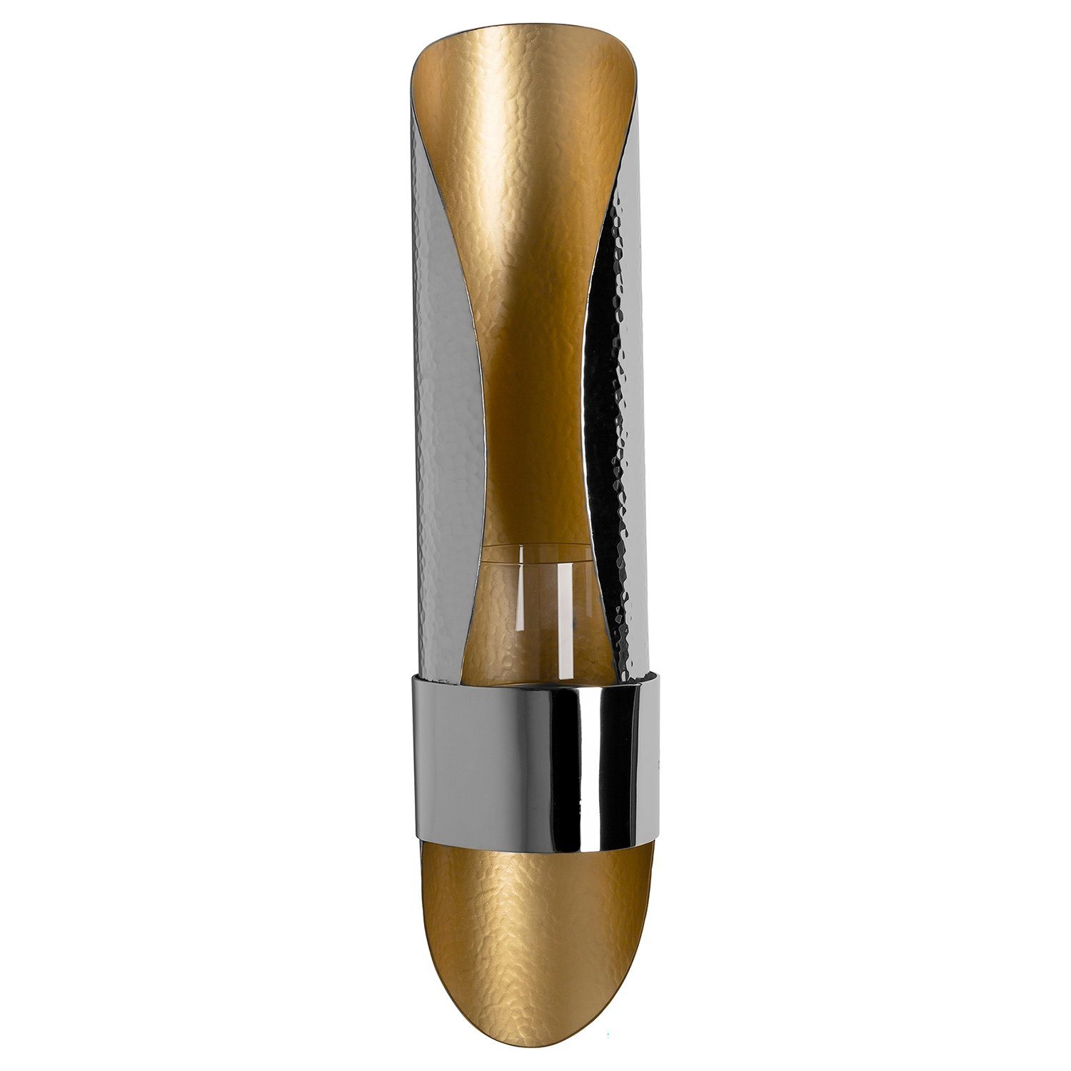 Der FINK Wandleuchter MUSETTE ist die perfekte Wandlichtquelle für Ihr Zuhause. Dieser elegante Wandstrahler aus hochwertigem, vernickeltem Aluminium besticht durch seine silberfarbene, gehämmerte Oberfläche, die jedem Raum einen Hauch von Luxus verleiht. Die innen goldfarben gesprühte Oberfläche sorgt für ein warmes, einladendes Licht, das sowohl im Wohnzimmer als auch im Schlafzimmer eine gemütliche Atmosphäre schafft. Als vielseitiger Wandfluter kann der MUSETTE sowohl als Dekoleuchter als auch als stilvoller Kerzenleuchter eingesetzt werden. Mit einer Höhe von 49,5 cm und einem Durchmesser von 11 cm fügt sich dieser Wandleuchter harmonisch in jede Einrichtung ein. Bitte beachten Sie, dass der MUSETTE nicht für den Außenbereich geeignet ist und keine scheuernden, säurehaltigen Reinigungsmittel verwendet werden sollten. Ein optionaler Glaszylinder (Artikelnummer 113001) kann hinzugefügt werden, um das Design zu vervollständigen. Verwenden Sie zur Pflege ein sanftes Reinigungsmittel und eine weiche Bürste oder ein Tuch, um die Schönheit dieses einzigartigen Dekoelements zu bewahren.