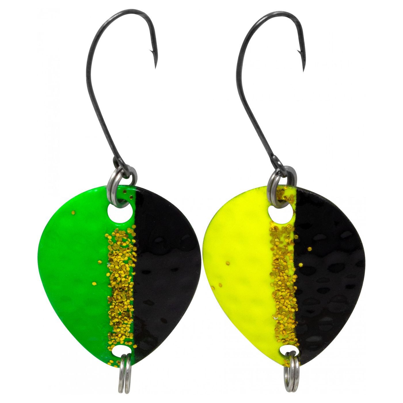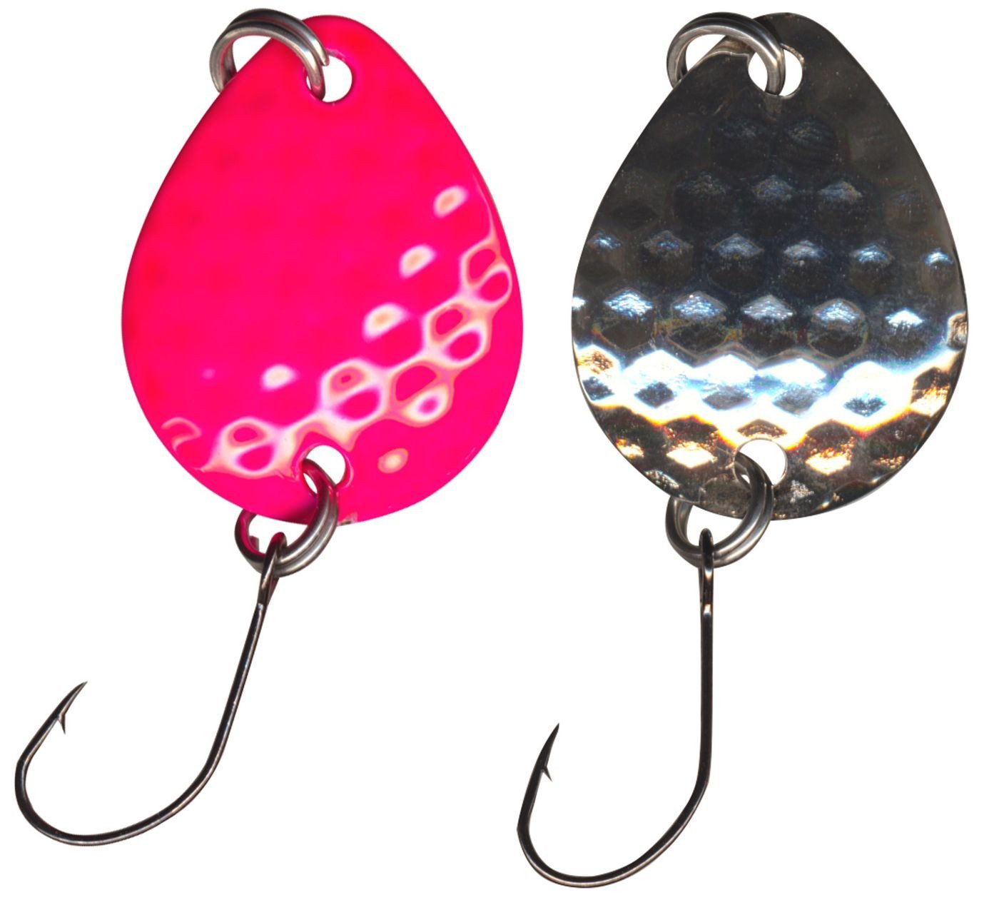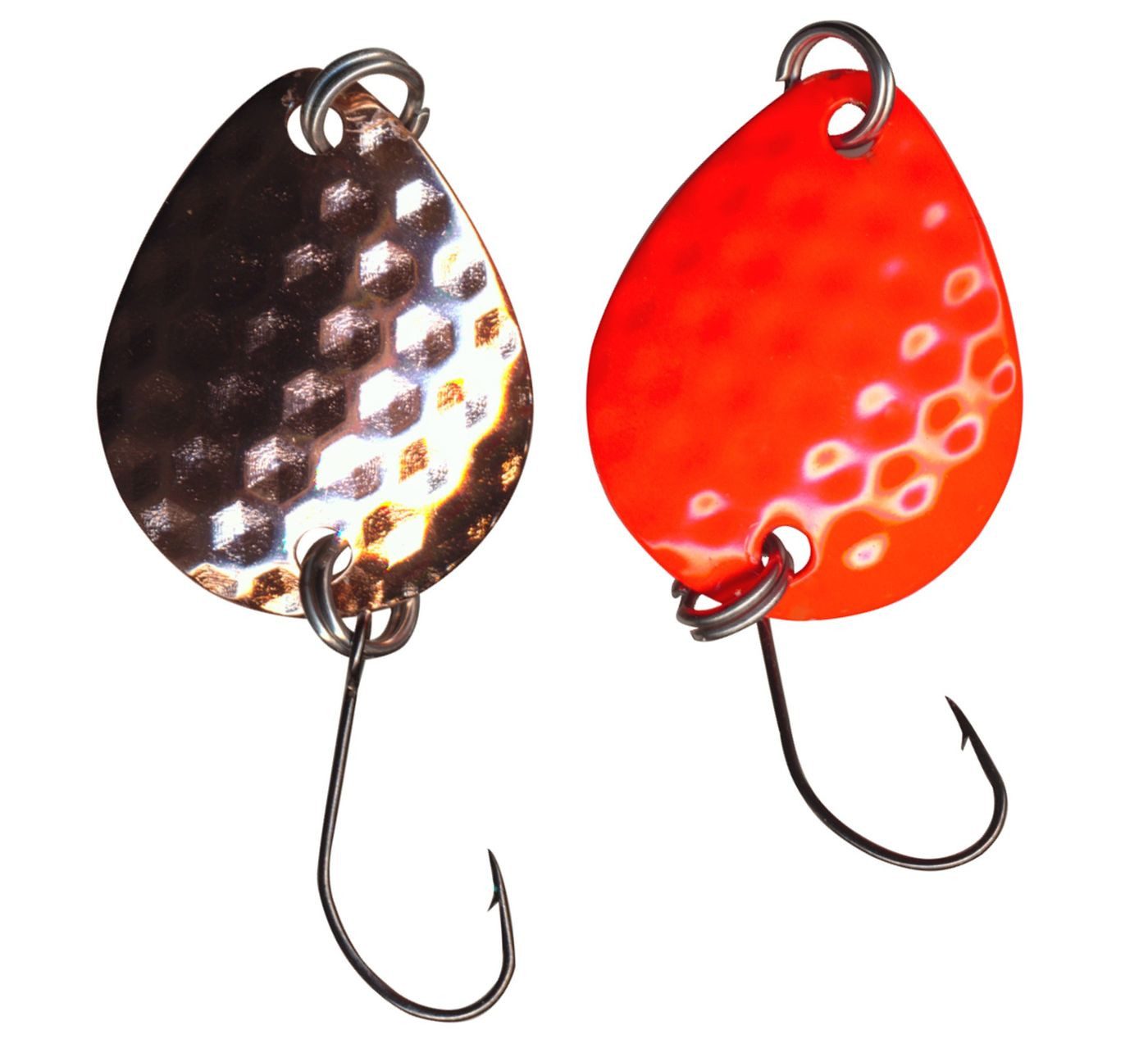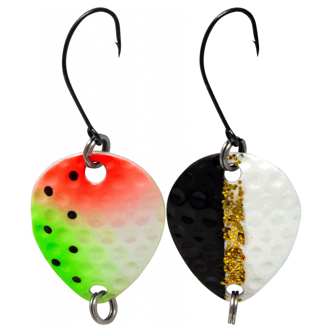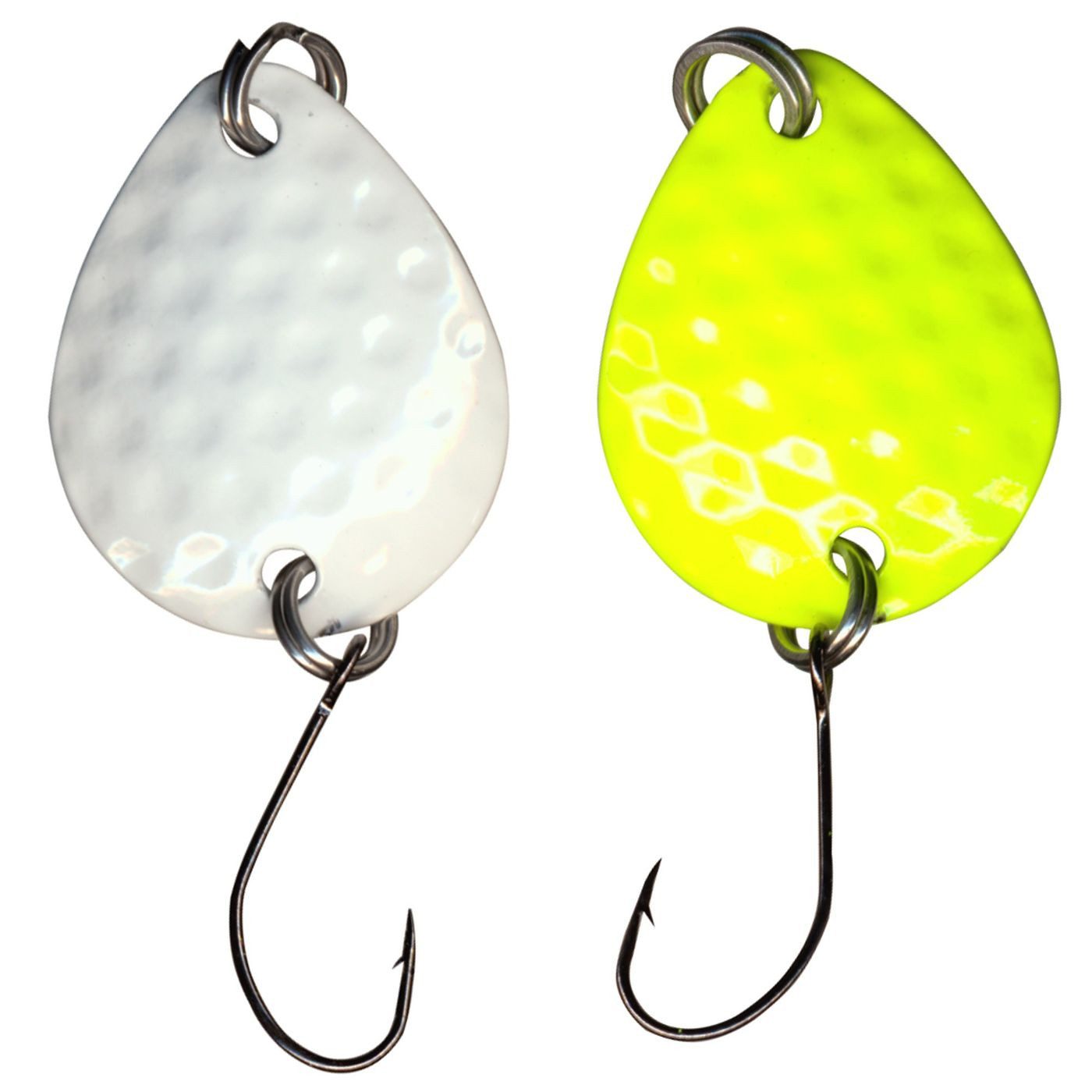 FTM Bilg Spoon - 2 Plättchen Forellenblinker - Die Forellenspoons von FTM imitieren einen kleinen Beutefisch und dienen zum Spinnfischen auf Forellen in Forellenteichen und Forellenseen. Trotz ihrer geringen Розмір und des leichten Gewichtes von nur 1,7g besitzen die Forellenköder gute Wurfeigenschaften und einen tollen Köderlauf. Aufgrund der flachen und runden Form lassen sich die Forellenblinker sehr langsam führen, wodurch verschiedene Gewässerbereiche ausgiebig abgefischt werden können. Dabei entfalten sie verführerische Laufeigenschaften, wodurch die Salmoniden zum Kunstköder gelockt werden. Die Forellenblinker können nach dem Auswerfen sowohl ganz einfach eingeholt als auch mit leichten Rutenschlägen getwitcht werden. Die scharfen und stabilen Einzelhaken besitzen einen guten Hakeffekt im Forellenmaul und sie halten auch kapitalen Lachsforellen problemlos stand.