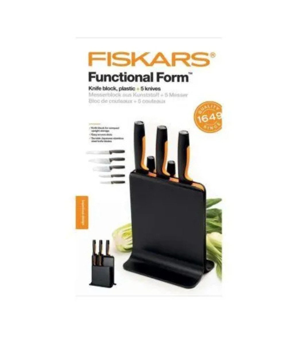 Der Fiskars Functional Form Messerblock vereint elegantes Design und Funktionalität. Der robuste Kunststoffblock hält fünf essentielle Messer mit scharfen Klingen aus japanischem Edelstahl sicher griffbereit.