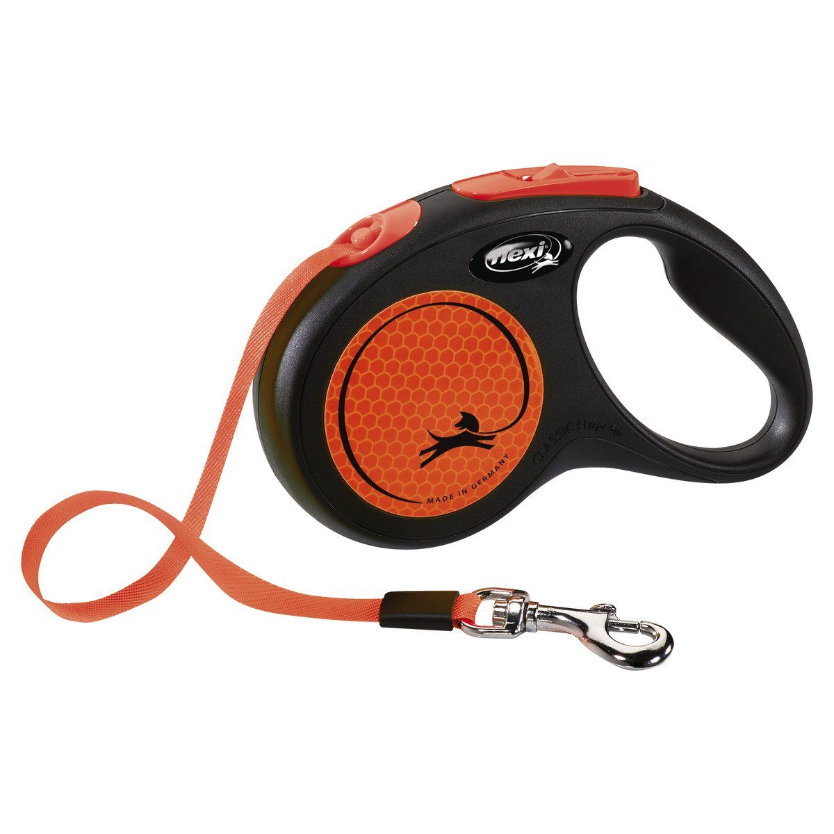 Diese Gurt-Roll-Leine des bekannten Qualitätsherstellers Flexi ist mit dem Kurzhub-Bremssystem ausgestattet und fällt mit dem schwazen Gehäuse und der stark reflektierenden neonfarbenen Komponente sofort ins Auge.