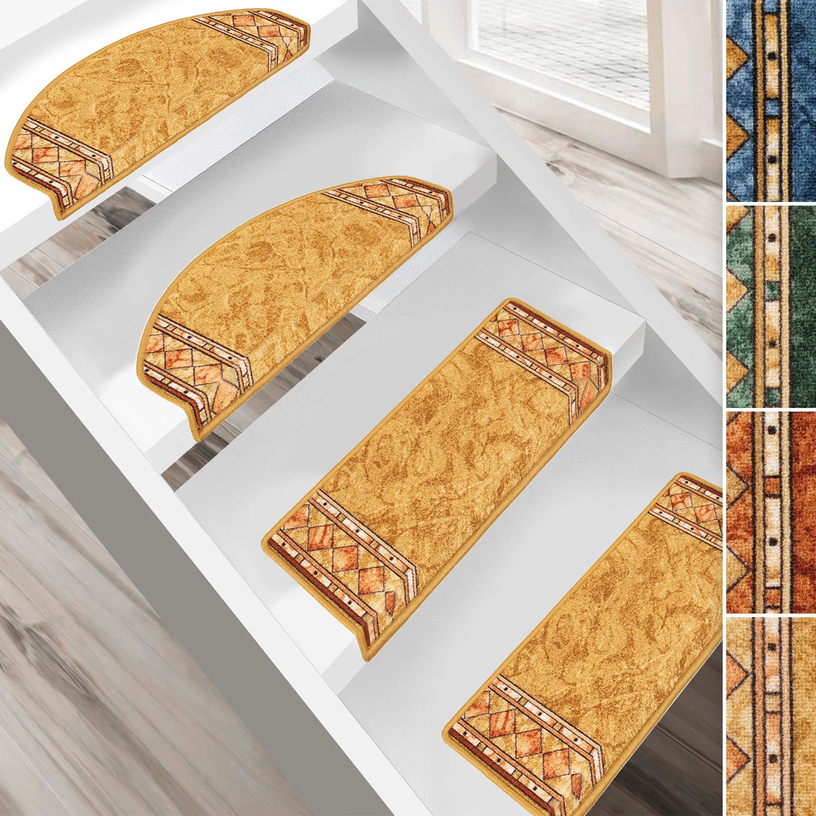 Damit die Stufenmatten gut und fest auf den Stufen liegen, sind sie mit einem stabilen, extra breiten Kunststoffwinkel und einem ebenso großzügig dimensionierten, 40 Millimeter breiten Klebestreifen ausgestattet. Eine farblich abgestimmte Umkettelung schützt die im Alltag stark beanspruchten Mattenränder und sorgt gleichzeitig für einen sauberen, optischen Abschluss. Erhältlich sind die Treppenteppiche nicht nur in verschiedenen Farben, sondern auch in zwei Formen. Als rechteckige Варіанти, die sich insbesondere für große Treppenstufen eignet, oder als halbrunde Ausführung, die sich ausgezeichnet für eine Nutzung auf Wendeltreppen anbietet.