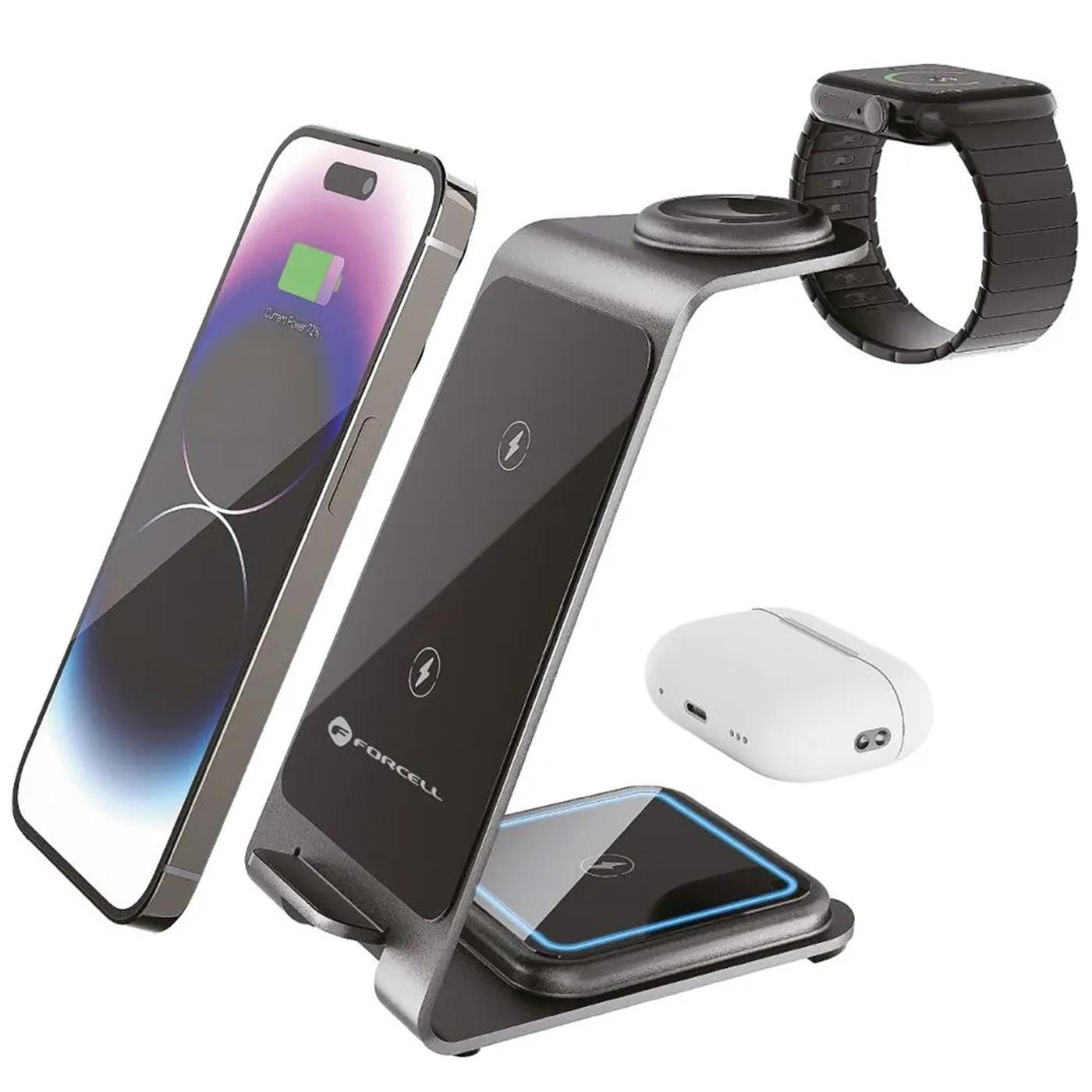 Mit der Forcell 3-in-1 Ladestation kannst du Smartphone, Smartwatch und Kopfhörer gleichzeitig kabellos laden. Das moderne Design passt perfekt auf jeden Schreibtisch oder Nachttisch und sorgt für Ordnung ohne Kabelsalat. Kompatibel mit Apple, Samsung und anderen Qi-fähigen Geräten.