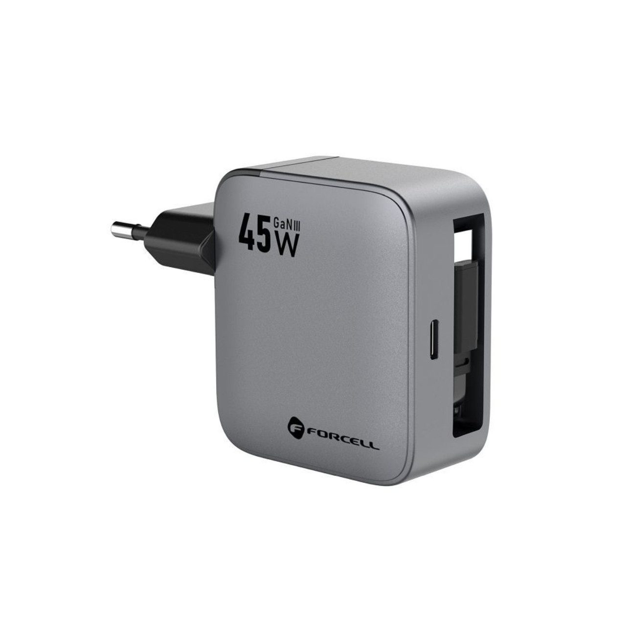 Das FORCELL F-ENERGY GaN III VT-R5 ist ein modernes Reise-Ladegerät mit 45 W Leistung und innovativer GaN-III-Technologie für höchste Effizienz. Es bietet einen USB-C-Anschluss sowie ein integriertes, 65 cm langes, aufrollbares USB-C-Kabel. So können Sie zwei Geräte gleichzeitig schnell und sicher laden – ganz ohne zusätzliches Zubehör. Mit Unterstützung für Power Delivery (PD) und Quick Charge 4.0 sorgt das Ladegerät für extrem kurze Ladezeiten. Das kompakte, graue Gehäuse ist ideal für unterwegs und dank Schutzmechanismen vor Überhitzung, Überspannung und Überlastung besonders sicher.