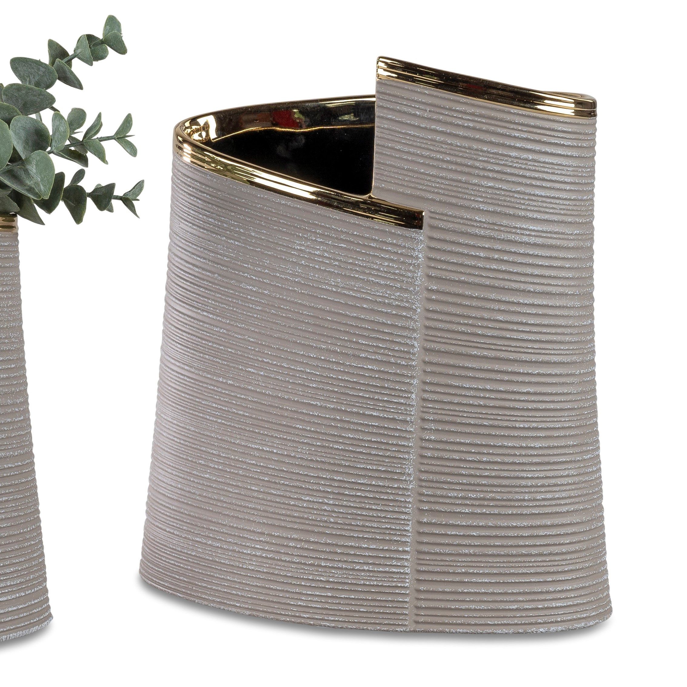 - Lieferumfang: 1 Deko Vase GOLDSAND oval H. 25cm B. 21cm grau gold aus Keramik mit matter, reliefierter Oberfläche und goldenem Rand