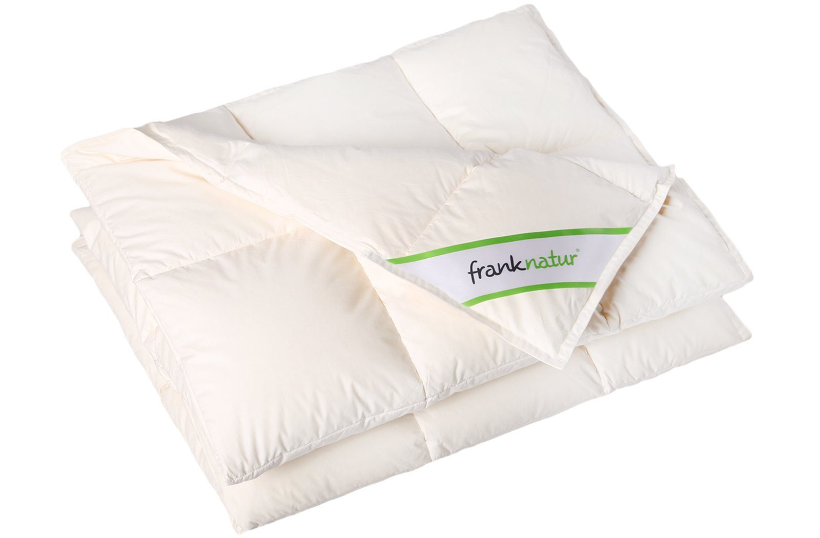 Diese Daunendecke können Sie überwiegend ganzjährig nutzen. Die Naturdecke besteht aus einer Füllung aus 100% Gänsedaunen und einem Bezug aus 100% Bio-Baumwolle. Durch die Absteppung des Kassettenbettes wird das Verrutschen der Füllung verhindert, diese bleibt permanent gleichmäßig über die Decke verteilt. Die Daunenfüllung schafft ideale Voraussetzungen für einen hohen Schlafkomfort, durch ihr geringes Gewicht und hervorragende Klimaregulierung. Die NOMITE-Zertifizierung bezeichnet zudem eine Eignung für Hausstauballergiker (Schutz durch das federn- und daunendichte Hüllengewebe und eine sehr ungünstige Umgebung für Milben durch Daunen/Federfüllung)