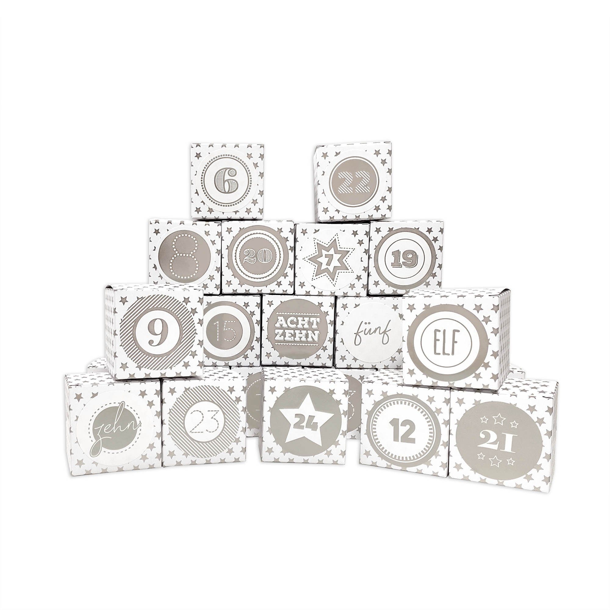 Süßer Frau WUNDERVoll® DIY Adventskalender zum individuellen, persönlichen Gestalten und Befüllen. Zu Kindertagen war ER das allergrößte um die Zeit bis zum Heiligenabend zu verkürzen, der gute alte Adventskalender. Im Lieferumfang sind alle aufeinander abgestimmten Materialien enthalten. Die stabilen Faltschachtel bieten Platz, z.B. für ein Überraschungsei oder ein Radiergummi. Zusammen mit den XL Adventskalenderzahlen ( Ø 6 cm), wirst du Deinen Liebsten sicherlich eine Große Freude bereiten.