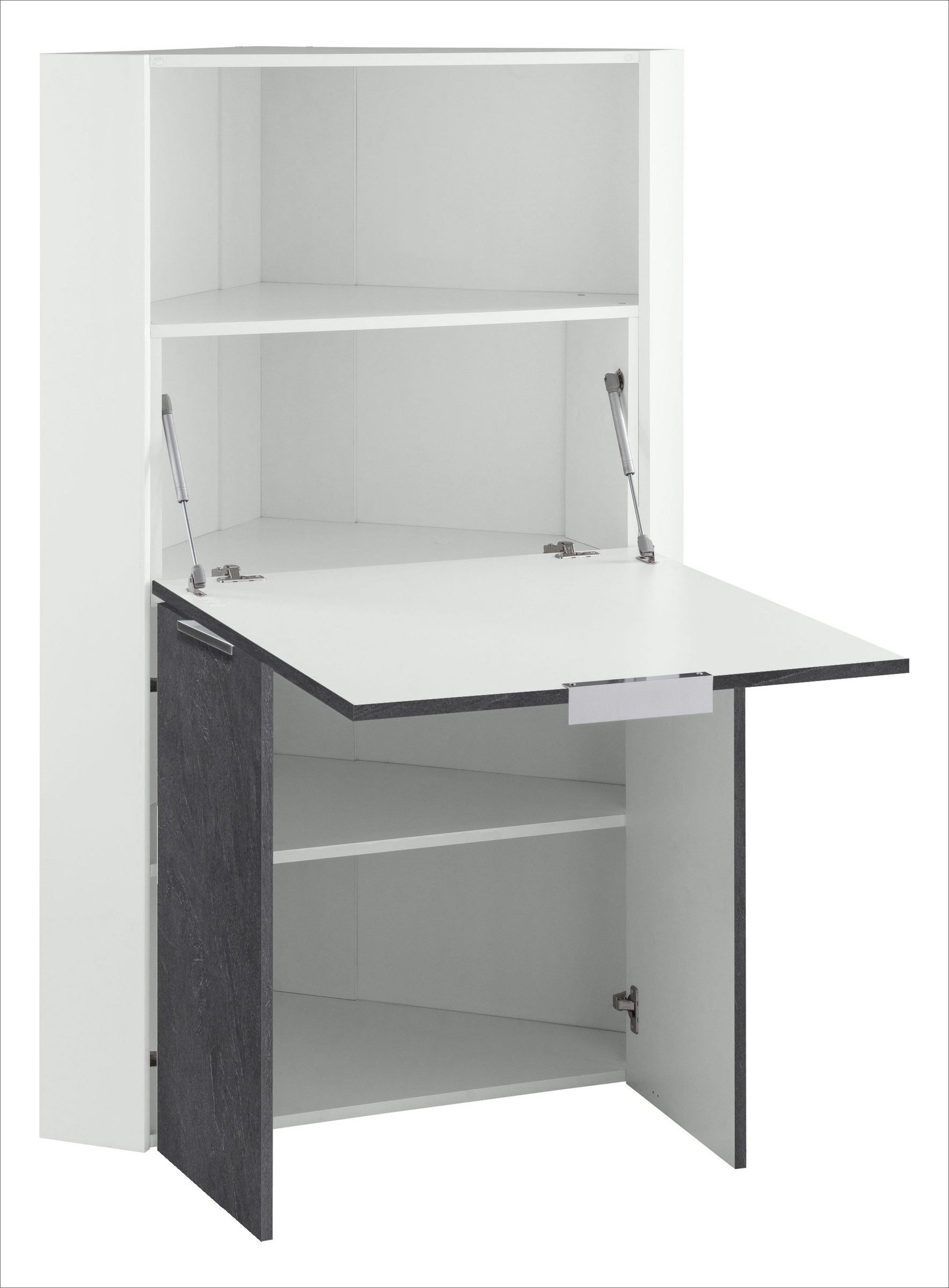 Der Eckschreibtisch Desenzano vereint modernes Design mit hoher Funktionalität und ist die ideale Lösung für Ihr Homeoffice. Mit einer Breite von 70 cm, einer Höhe von 140 cm und einer Tiefe von 57 cm bietet er ausreichend Platz für Ihre Arbeitsutensilien und einen komfortablen Arbeitsplatz. Die elegante Farbgebung in Weiß Hochglanz für den Korpus und Schiefer Nachbildung für Türen und Klappen sorgt für eine stilvolle Atmosphäre. Dieses Möbelstück fügt sich harmonisch in verschiedene Einrichtungsstile ein und setzt gleichzeitig ein modernes Statement. Der Desenzano Eckschreibtisch besteht aus melaminharzbeschichteter Spanplatte, die für ihre Robustheit und Langlebigkeit bekannt ist. Die Melaminharzbeschichtung macht die Oberfläche besonders pflegeleicht und widerstandsfähig gegen Kratzer und Feuchtigkeit. Das Material ist zudem FSC®-zertifiziert, was garantiert, dass es aus nachhaltiger und verantwortungsvoller Forstwirtschaft stammt. Die Kombination aus Weiß Hochglanz und Schiefer Nachbildung verleiht dem Schreibtisch ein modernes, elegantes Aussehen, das zu jeder Büroeinrichtung passt. Der Schreibtisch ist mit praktischen Stauraumlösungen ausgestattet. Er verfügt über zwei Drehtüren, die zusätzlichen Platz für Dokumente und Bürobedarf bieten, sowie eine Klappe, die einen schnellen Zugriff auf häufig benötigte Utensilien ermöglicht. Zwei Einlegeböden im Inneren der Türen sorgen für zusätzliche Ordnung und Flexibilität. Diese durchdachte Aufteilung hilft Ihnen, Ihren Arbeitsplatz effizient zu organisieren und gleichzeitig einen aufgeräumten und eleganten Eindruck zu hinterlassen. Die Lieferung des Eckschreibtisches Desenzano erfolgt zerlegt, was einen sicheren Transport gewährleistet und Ihnen ermöglicht, das Möbelstück bequem nach Hause zu bringen. Im Lieferumfang ist eine detaillierte Montageanleitung enthalten, die Ihnen Schritt für Schritt beim Aufbau hilft. Dank der klaren Anweisungen und der einfach zu handhabenden Teile können Sie den Schreibtisch