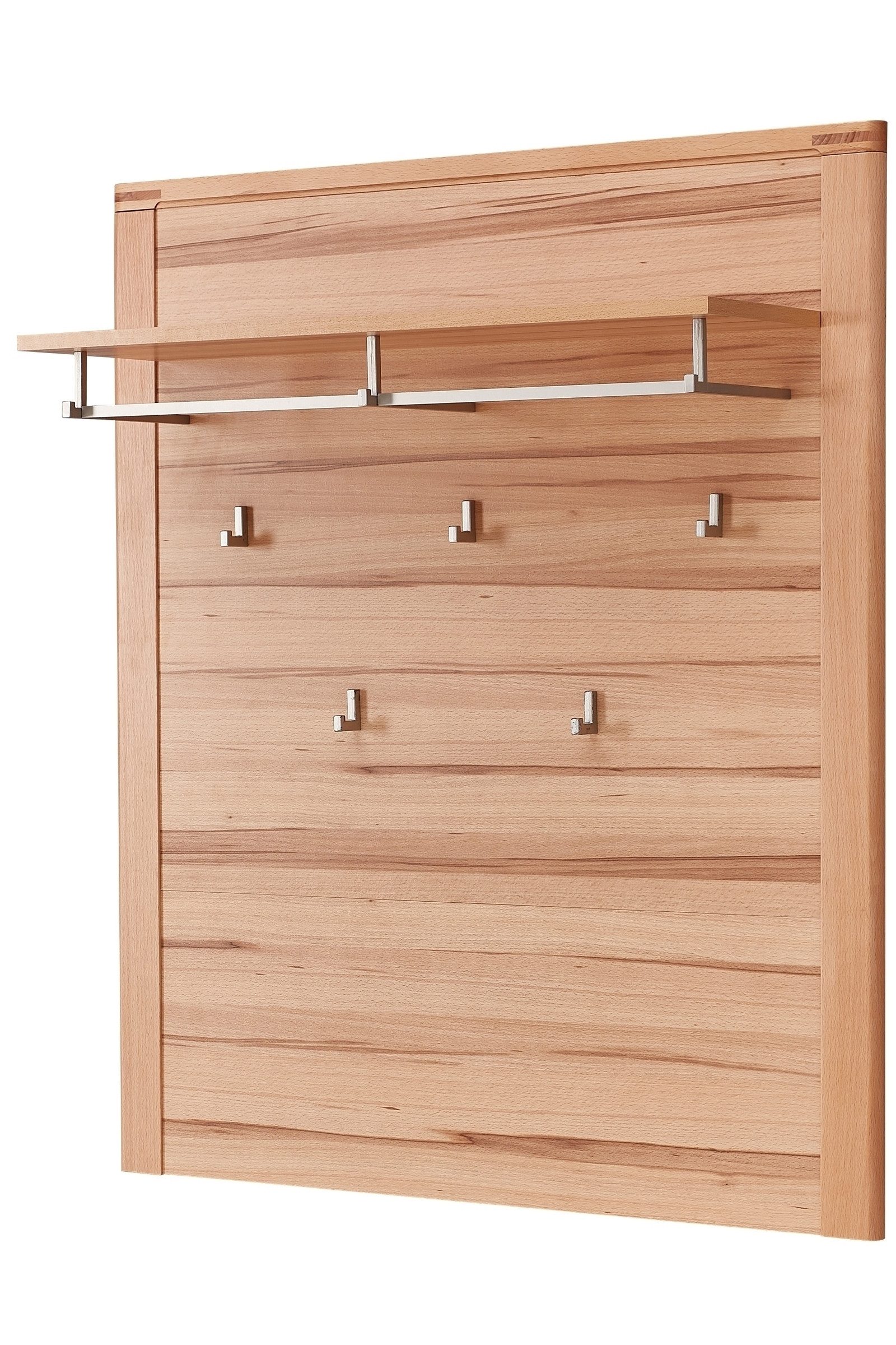Das Garderobenpaneel Nature One vereint modernes Design mit praktischer Funktionalität und ist die perfekte Ergänzung für jeden Flur. Mit den kompakten Abmessungen von 90/110/29 cm (B/H/T) bietet es ausreichend Platz für Jacken, Mäntel und Accessoires, ohne dabei viel Raum einzunehmen. Der Rahmen aus massiver Kernbuche verleiht eine natürliche und warme Ausstrahlung, während das Paneel aus Spanplatte und Holzwerkstoff E1 in Kernbuche-Nachbildung die Optik harmonisch abrundet. Die lackierte Oberfläche schützt das Holz und sorgt für eine glatte, pflegeleichte Struktur. Das Paneel ist mit fünf stabilen Haken ausgestattet, die genügend Platz für Ihre Garderobe bieten. Ein zusätzlicher Einlegeboden eignet sich ideal für Hüte, Taschen oder Dekorationen und ist bis zu 2 kg belastbar. Dank des durchdachten Designs lassen sich Ihre Alltagsgegenstände übersichtlich und griffbereit organisieren. Das moderne Erscheinungsbild des Nature One Garderobenpaneels fügt sich nahtlos in verschiedene Wohnstile ein. Die hochwertige Verarbeitung der Materialien garantiert eine lange Lebensdauer, während die natürliche Holzoptik eine einladende Atmosphäre schafft. Das Paneel wird im zerlegten Zustand geliefert und ist dank der beiliegenden Montageanleitung schnell und einfach aufgebaut. Es ist ideal für kleinere Räume oder als Teil einer kompletten Garderobenlösung geeignet. Mit dem Garderobenpaneel Nature One erhalten Sie ein stilvolles und funktionales Möbelstück, das durch Qualität, Ästhetik und Zweckmäßigkeit überzeugt. Perfekt für alle, die Wert auf ein modernes und zugleich natürliches Wohnambiente legen.