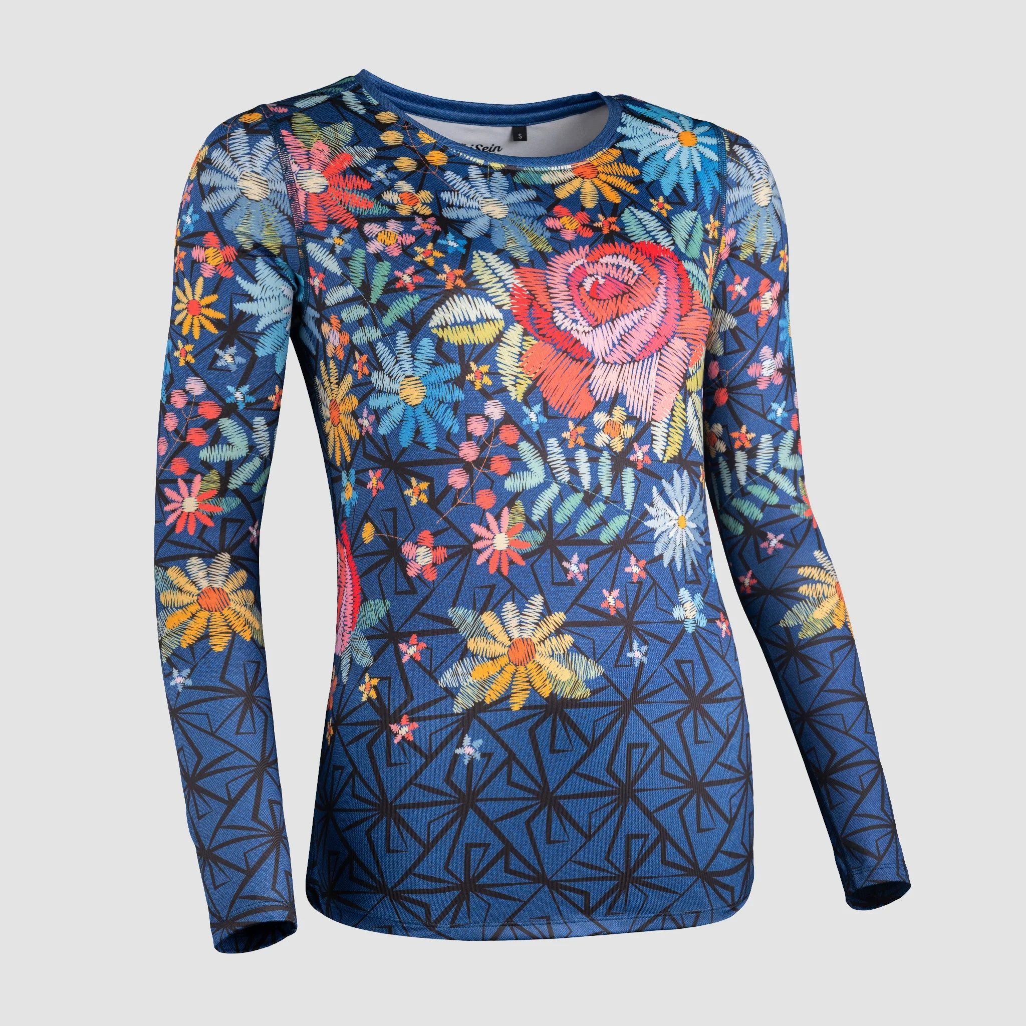 Egal ob im Frühling, Sommer, Herbst oder Winter – dieses Damen-Longsleeve ist der ideale Begleiter für jede Jahreszeit. Mit einem einzigartigen Blütendruck auf Jeanshintergrund, der handgemachte Stickerei und Pinselstriche kombiniert, bringt es Farbe in jede Garderobe.