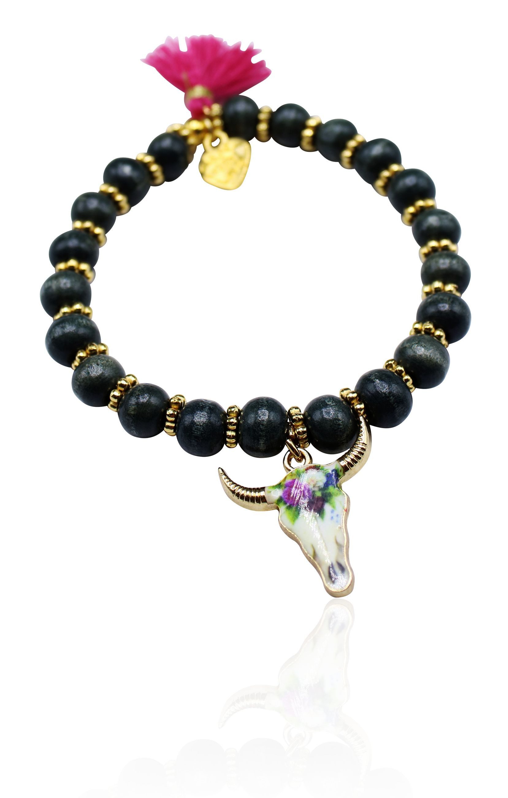 Damen Armband aus Holzperlen mit einem Anhänger mit emaillierten Büffelkopf. Dazwischen sind kleine goldene Spacer angebracht. Auch zu Tracht passt das elastische Armband hervorragend.