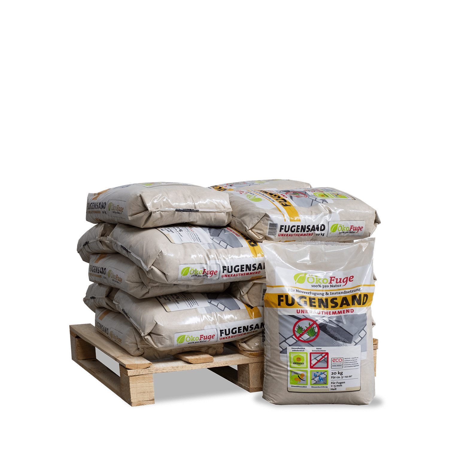 Fugensand sorgt für eine saubere und unkrautfreie Fläche im Garten. Pflasterflächen sehen mit der Zeit ungepflegt aus, wenn Unkraut durch die Fugen wächst. Das regelmäßige Entfernen ist mühsam, da Wurzeln tief sitzen und immer wieder austreiben. Mit dem hochwertigen Fugensand der Marke ÖKOFUGE® reduzieren Sie diesen Aufwand erheblich. Der feine Einkehrsand verdichtet sich optimal zwischen den Fugen und hemmt das Unkrautwachstum – ganz ohne chemische Mittel oder aufwendige mechanische Bearbeitung. Gleichzeitig bleibt der Boden wasserdurchlässig, sodass Regen problemlos versickern kann und keine Pfützen entstehen. ÖKOFUGE® Fugensand besteht aus getrocknetem Natursteinbrechsand mit einem bewuchshemmenden Zusatz. Das Material eignet sich für schmale Fugen von 1 bis 5 Millimetern und verteilt sich gleichmäßig. Es bleibt rieselfähig, klumpt nicht und füllt selbst kleinste Spalten zuverlässig aus. Damit sorgt der Sand für eine langanhaltend dichte und stabile Fugenstruktur. Der Fugensand ist vielseitig einsetzbar und ideal für Terrassen, Gehwege und Hofeinfahrten. Da er keinen Zementschleier hinterlässt, eignet er sich besonders für empfindliche Naturstein- oder Betonpflaster. Die Verarbeitung ist denkbar einfach: Das Material ist gebrauchsfertig und kann direkt ohne Wasser oder Bindemittel eingekehrt werden. Eine kurze Durchmischung mit der Schaufel vor der Anwendung genügt, um eine optimale Konsistenz zu gewährleisten. Durch seine natürlich helle Farbgebung fügt sich der Sand harmonisch in verschiedenste Pflasterflächen ein und eignet sich besonders gut für Natursteine aus Granit oder Sandstein. Dank der Zertifizierung durch das Eco-Institut wurde der Fugensand umfangreich auf mögliche Schadstoffe geprüft. Er erfüllt damit hohe Anforderungen an Qualität und Umweltverträglichkeit. Durch seine geprüfte Zusammensetzung eignet sich der Fugensand hervorragend für den Einsatz in Gärten, Hofanlagen und anderen Wohnbereichen im Außenbereich. Die Anwendung ist einfach und sorgt für stabile sowie gepflegte Fugen zwischen Pflastersteinen und Platten. Um die unkrauthemmende Wirkung dauerhaft zu erhalten, sollten die Fugen stets vollständig gefüllt und frei von Erde oder organischen Rückständen gehalten werden. In feuchten oder schattigen Bereichen kann sich Moos oder Algenbelag bilden, da diese keinen Wurzeln haben und somit nicht durch den Sand gehemmt werden. Ein pH-neutraler oder basischer Algenentferner hilft, diese Beläge zu beseitigen. Falls notwendig, kann nachträglich Fugensand nachgekehrt werden, um die Schutzwirkung aufrechtzuerhalten. Bestellen Sie Fugensand Natur bequem online. Ein 20-kg-Sack wird direkt per Spedition frei Bordsteinkante geliefert. Für größere Projekte sind auch Halbpaletten mit 15 Säcken oder Vollpaletten mit 50 Säcken verfügbar. Die Lieferung erfolgt zuverlässig bis zu Ihrem Grundstück, sodass Sie das Material direkt für Ihre Bauvorhaben nutzen können.