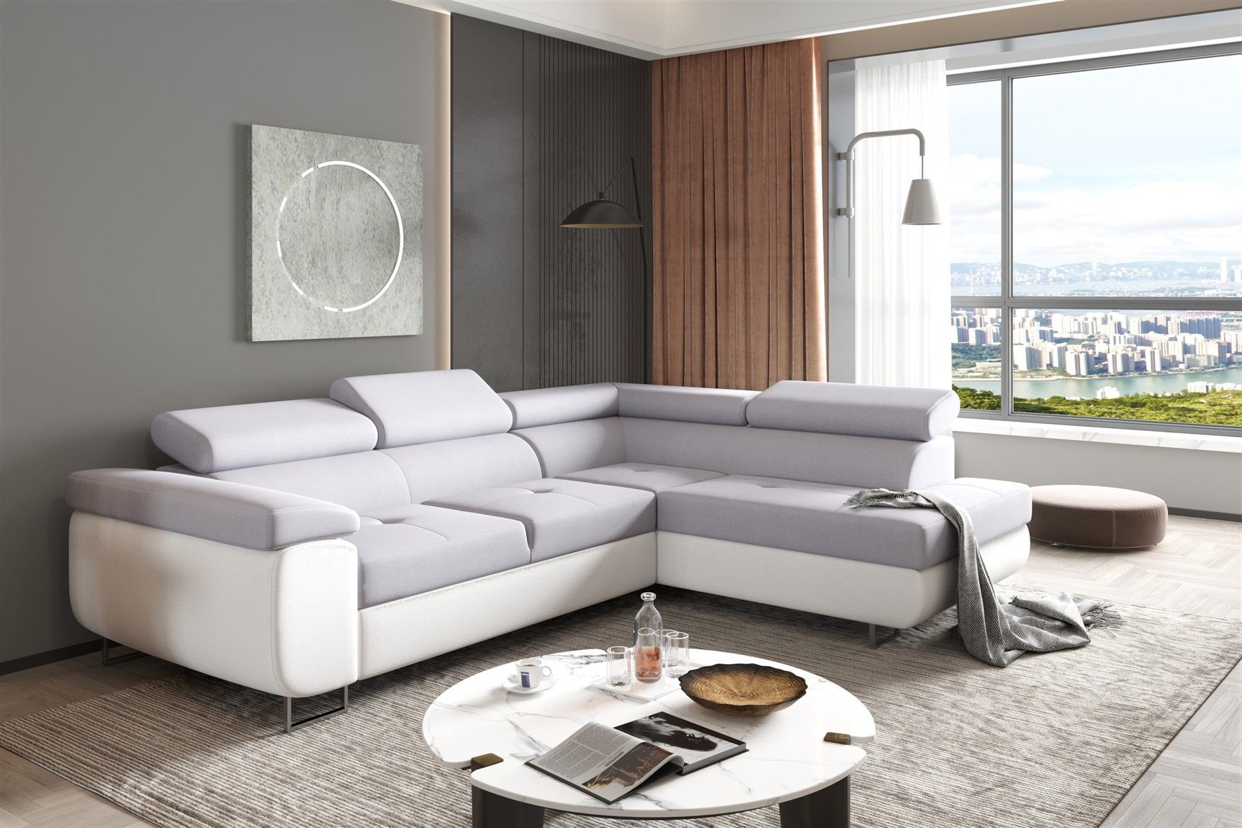 Ausführung | Couchgarnitur JADE Weiß-Hellgrau mit Schlaffunktion Ottomane Rechts |