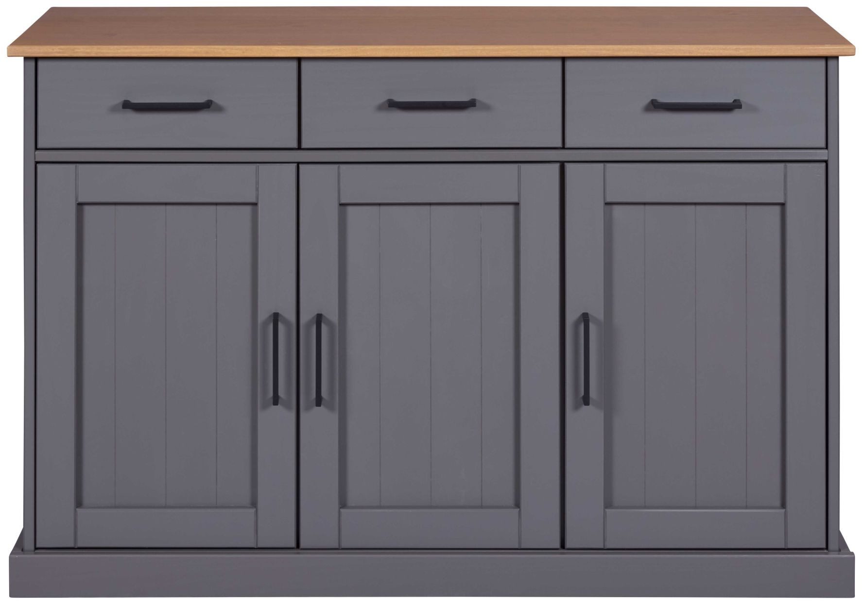 Die Kiefer Massivholz Anrichte im Landhausstil präsentiert sich mit einer eichenfarben lackierten Abdeckplatte und einem grauen Corpus, wobei die Farbauftragung geschickt gestaltet ist, um die natürlichen Holzmaserungen sichtbar zu lassen. Diese detailreiche Gestaltung verleiht dem Möbelstück einen charmanten und natürlichen Look. Hergestellt aus FSC-zertifiziertem Massivholz betont die Anrichte nicht nur ihre hochwertige Verarbeitung, sondern auch ihre Umweltfreundlichkeit. Mit 3 Türen und 3 Schubladen bietet sie großzügigen Stauraum und die Möglichkeit, die einzigartigen Holzdetails stilvoll zu präsentieren. Ein Möbelstück, das handwerkliche Qualität mit ästhetischem Feingefühl vereint.