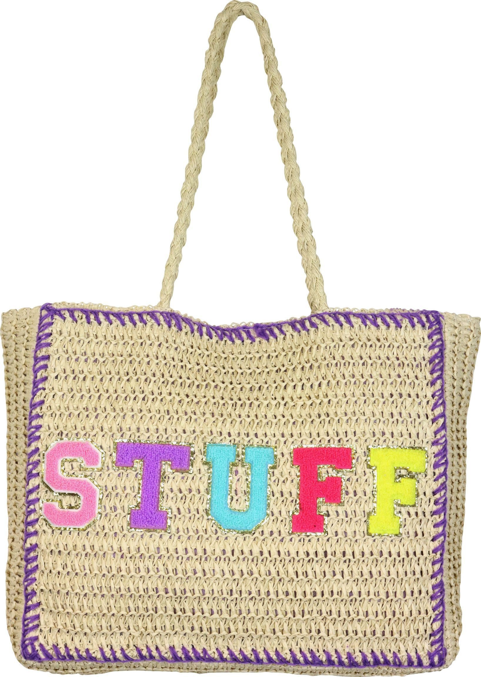 Diese handgefertigte Tasche aus Raffia-Bast, Baumwolle und Polyester ist mehr als nur ein praktisches Accessoire. Der auffällige âSTUFF-Schriftzug in bunten Farben macht sie zu einem echten Eyecatcher. Dank ihrer Розмір von ca. 39x34x11 cm bietet sie genug Platz für alle wichtigen Dinge --ob beim Stadtbummel, am Strand oder auf Reisen. Die geflochtenen Henkel liegen angenehm in der Hand oder über der Schulter, während das natürliche Material für Leichtigkeit und sommerliche Frische sorgt. Lila Ziernähte setzen farbliche Akzente und unterstreichen den individuellen Look der Tasche. Perfekt für stilbewusste Individualisten, die das Besondere lieben.